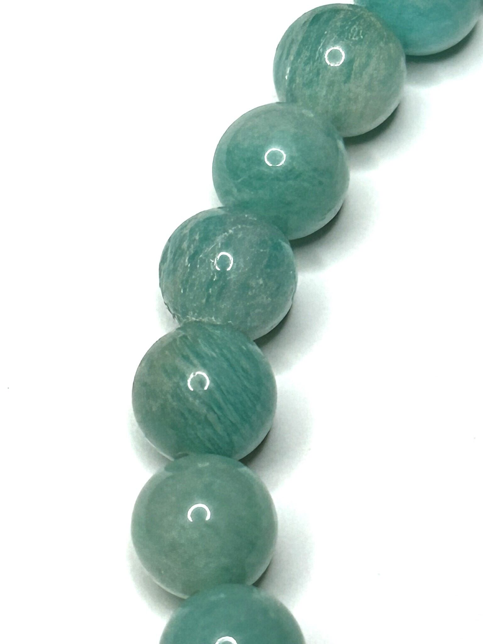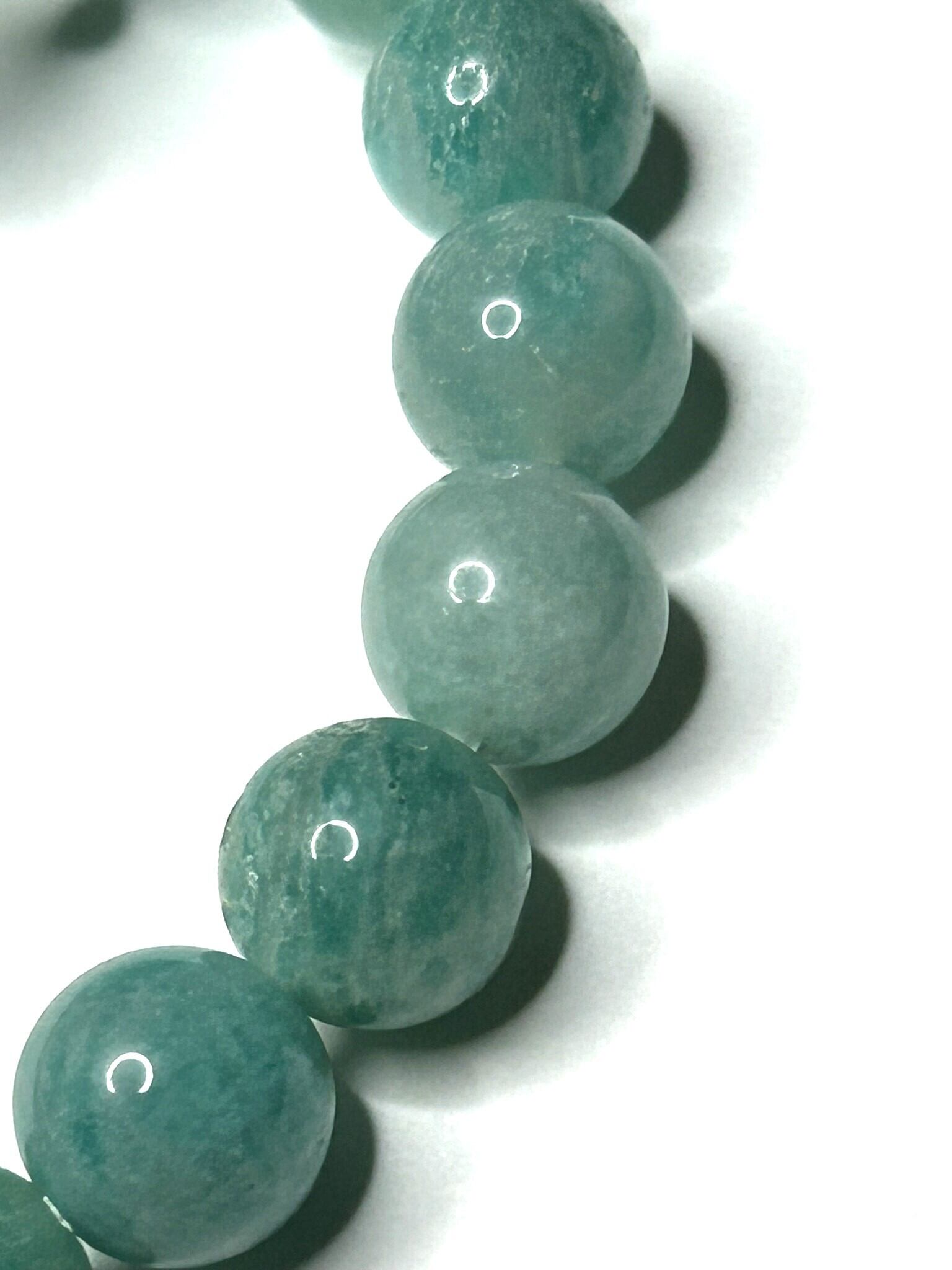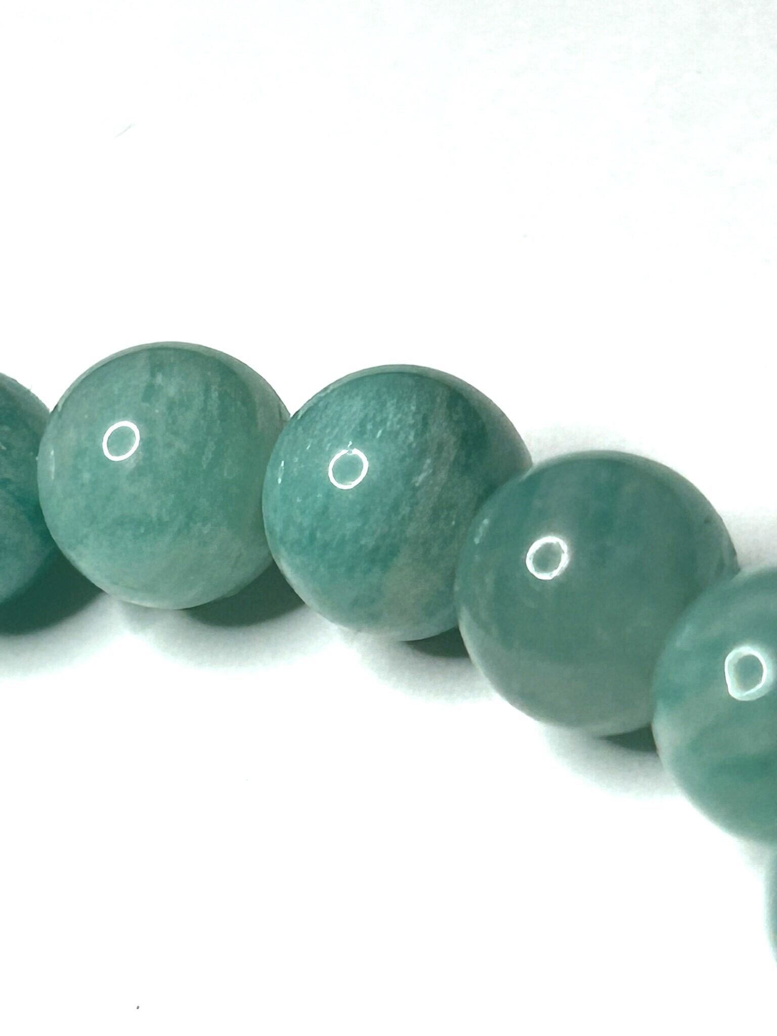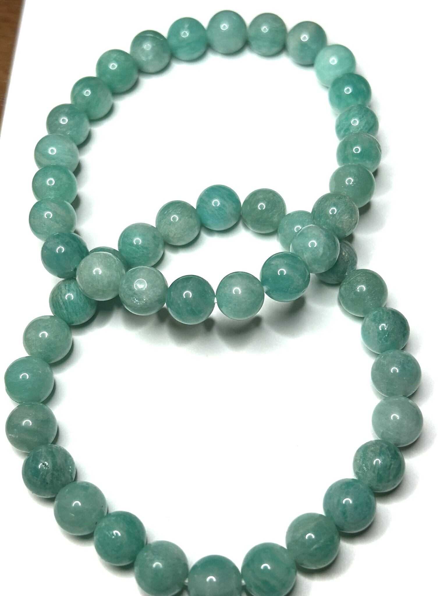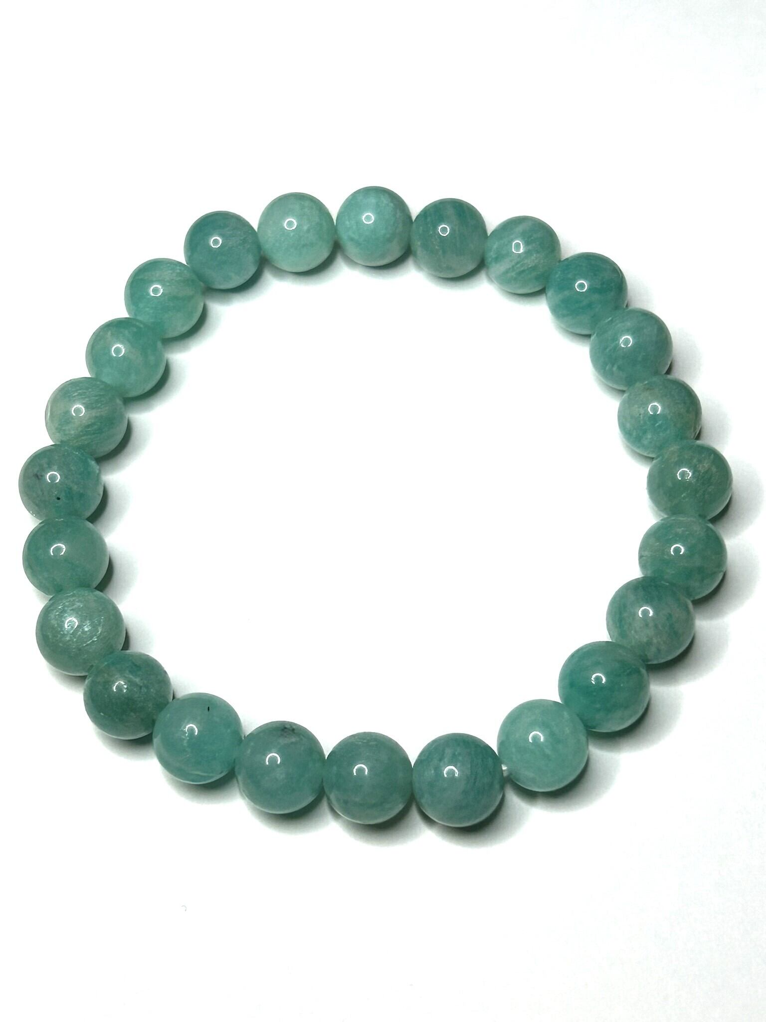 鮮やかな青緑色に白い縞模様が人気の天河石、アマゾナイトのブレスレットです。
