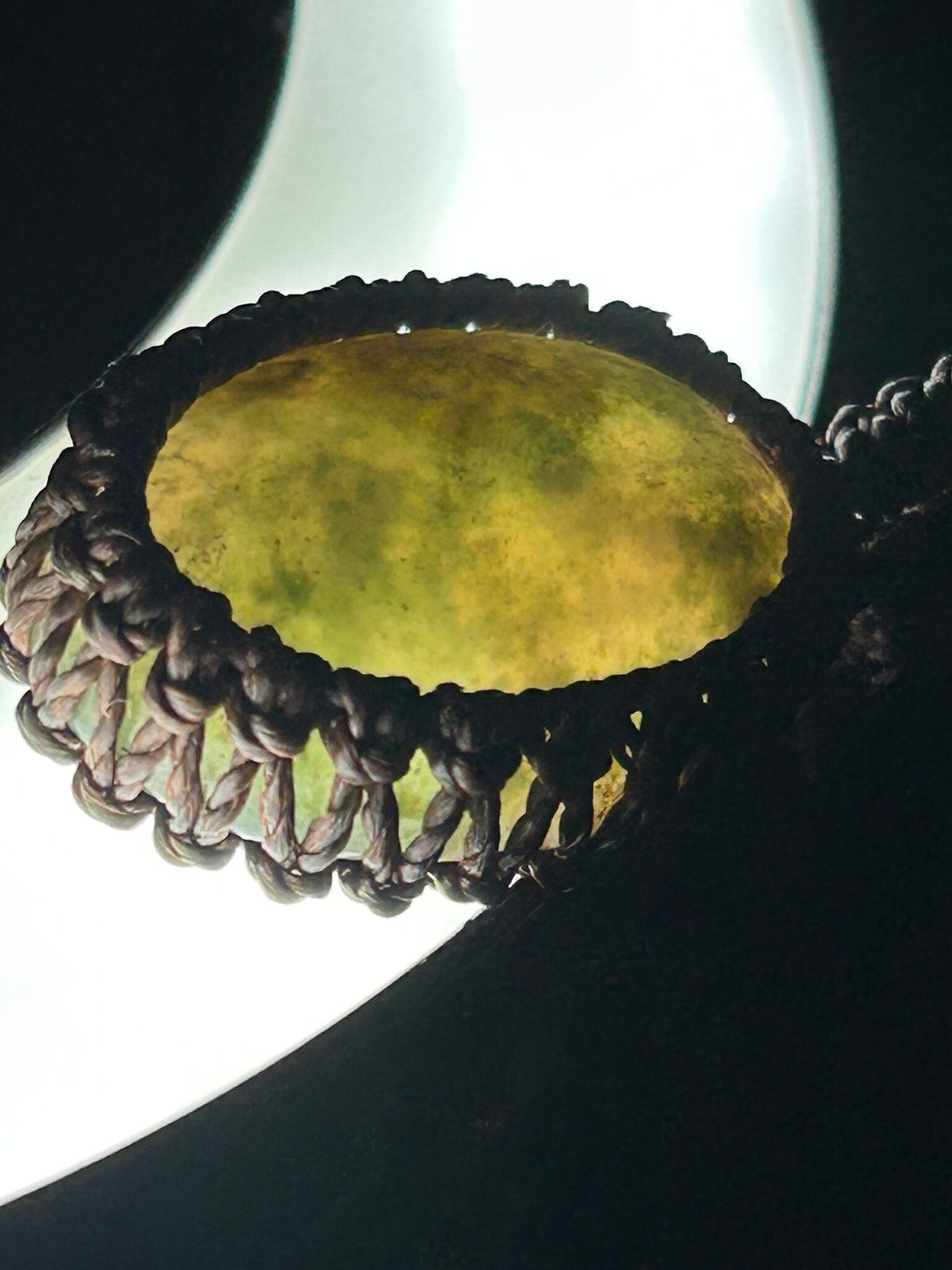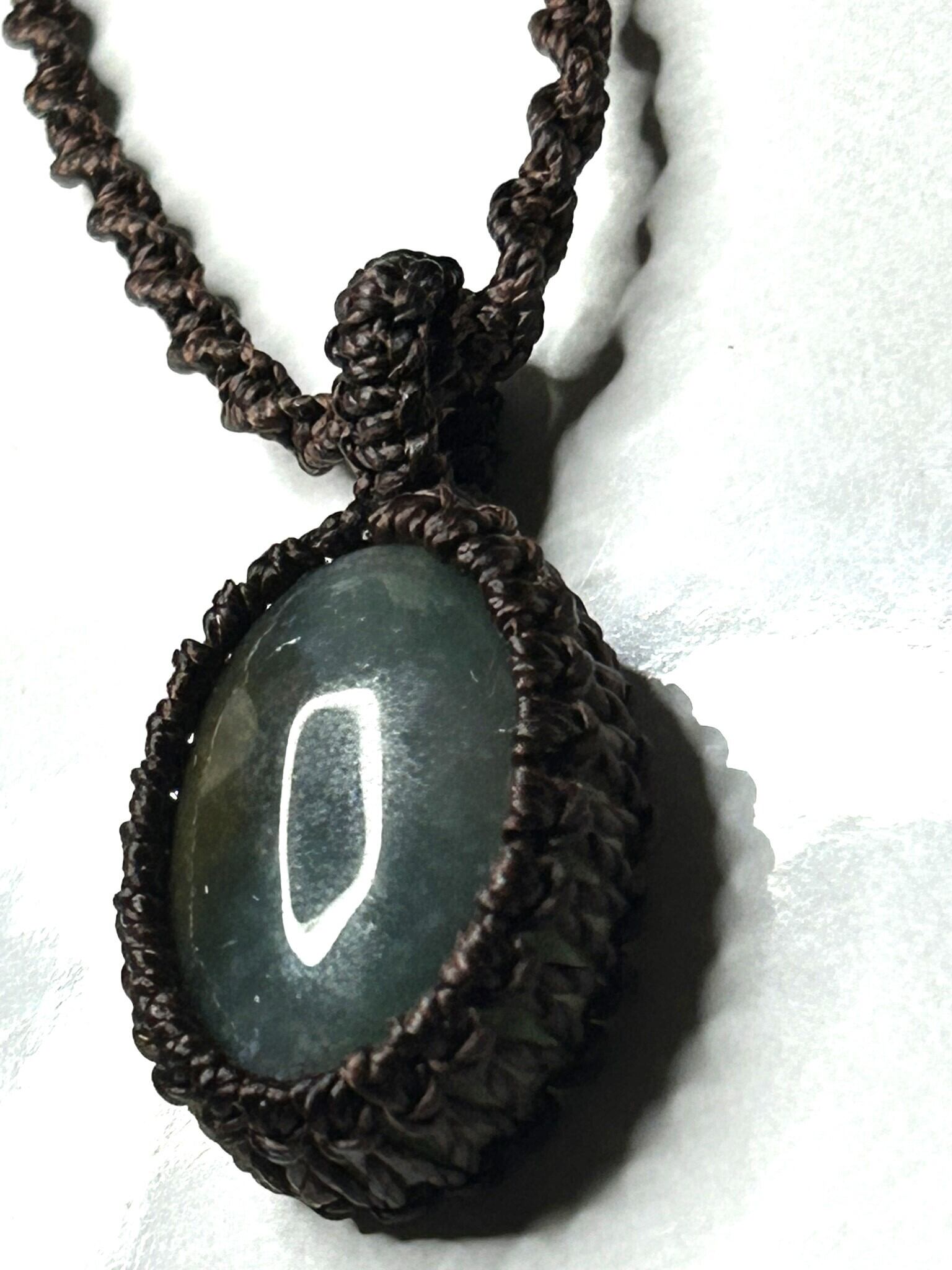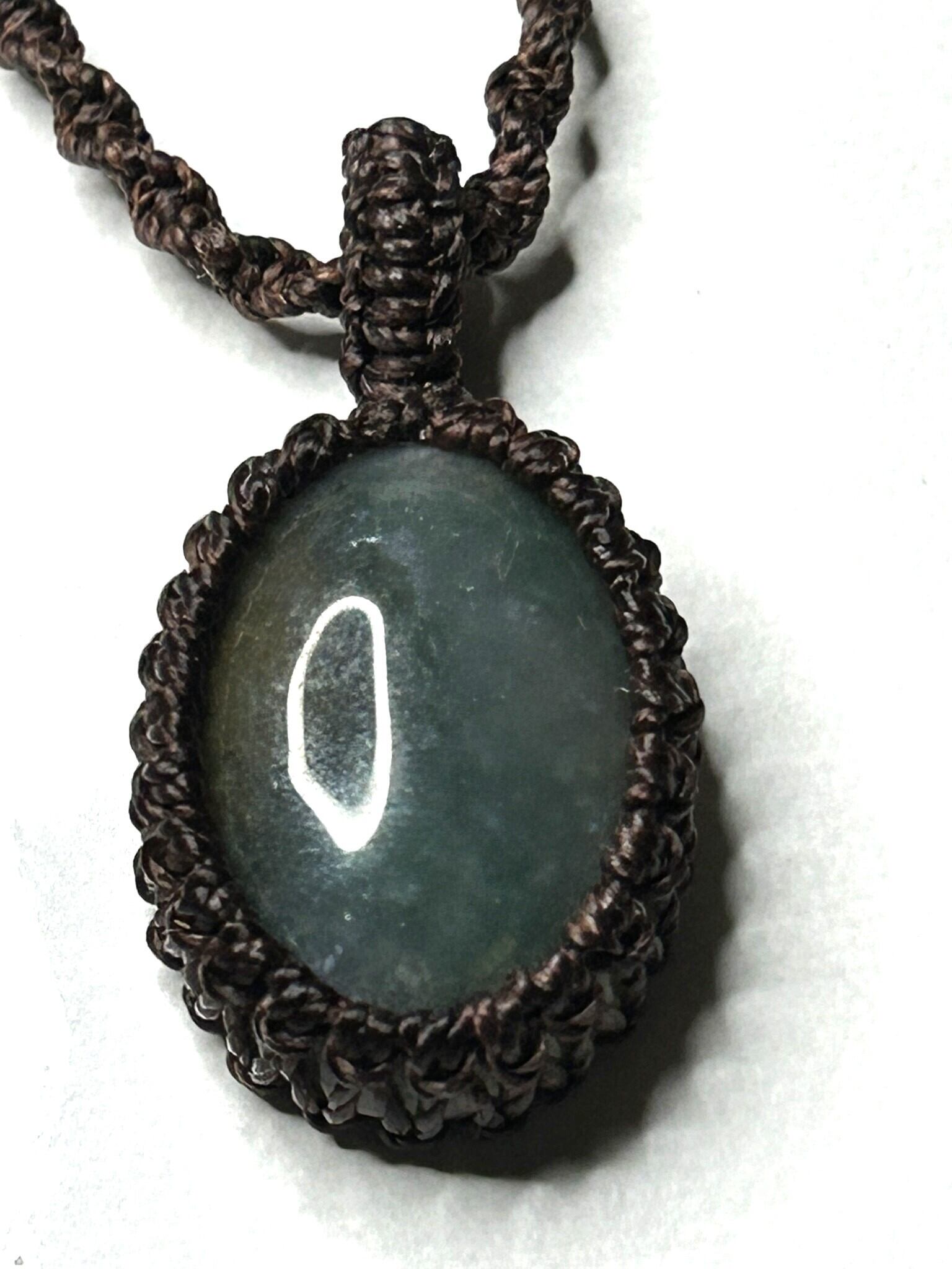モスアゲートのカボションをマクラメでペンダントにしました。
