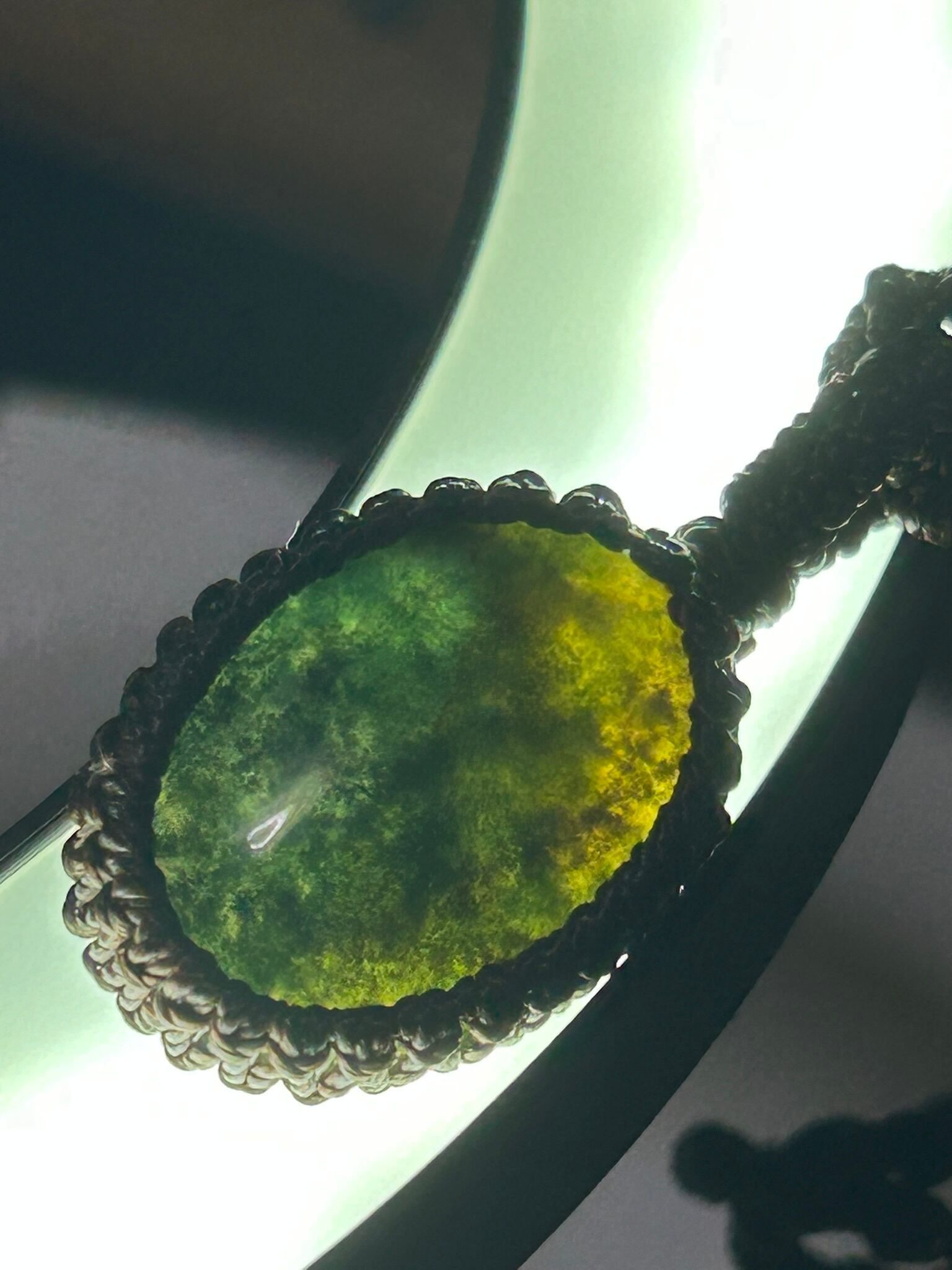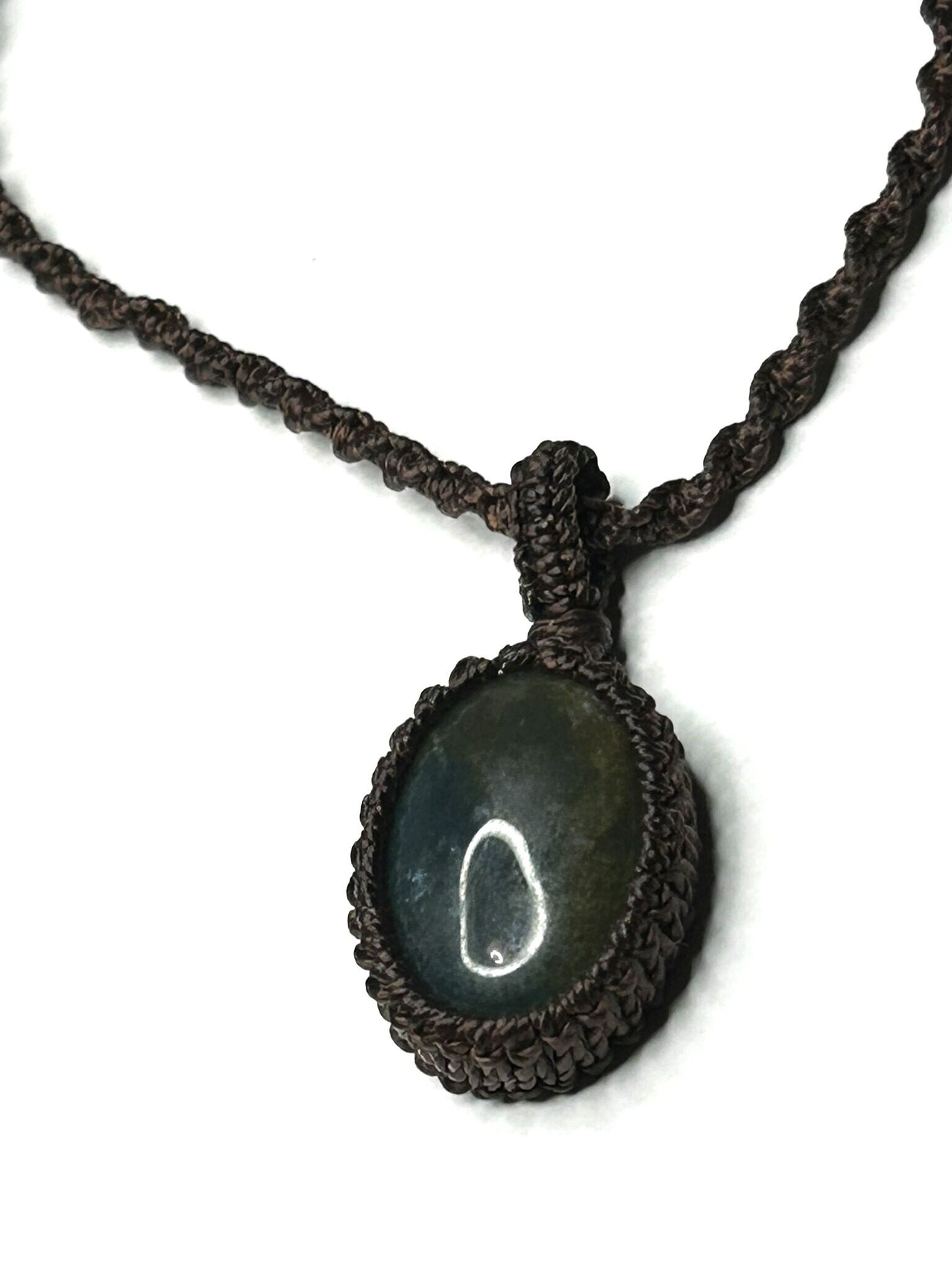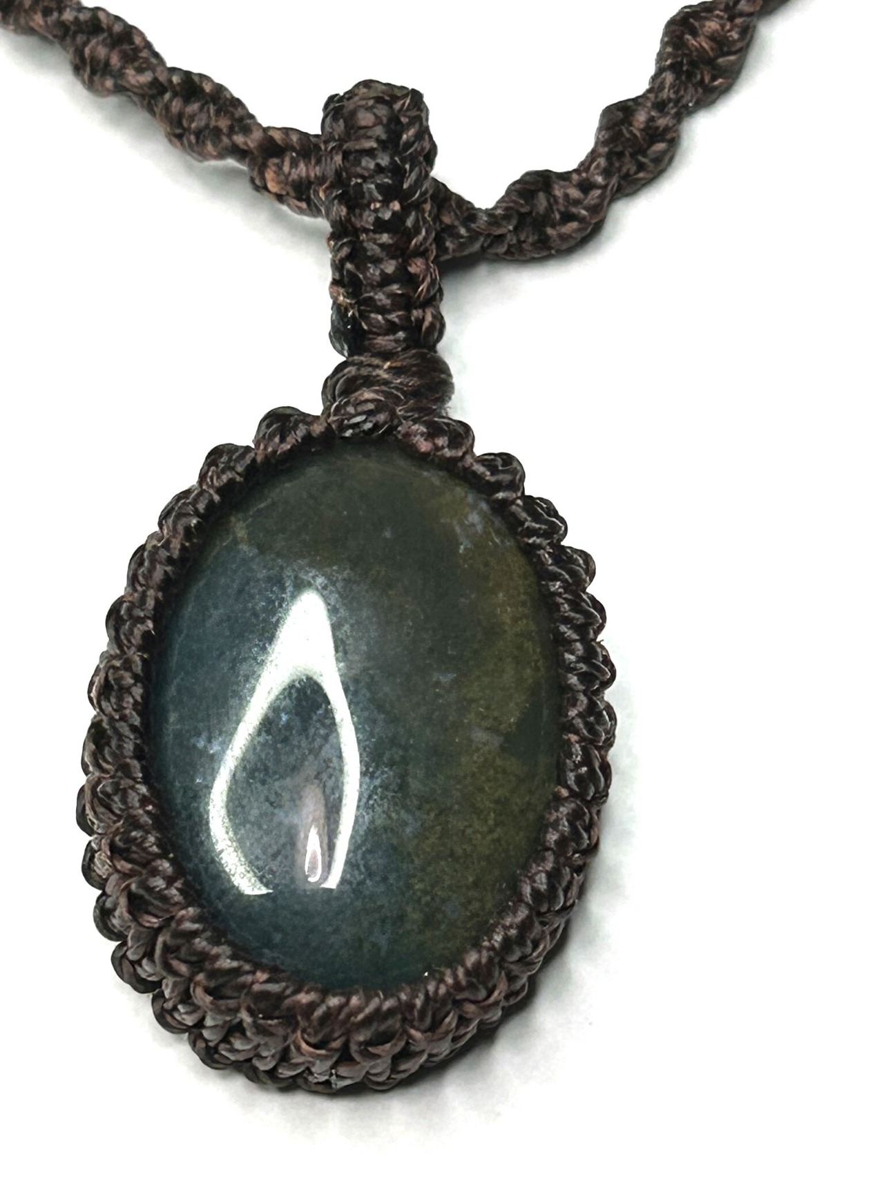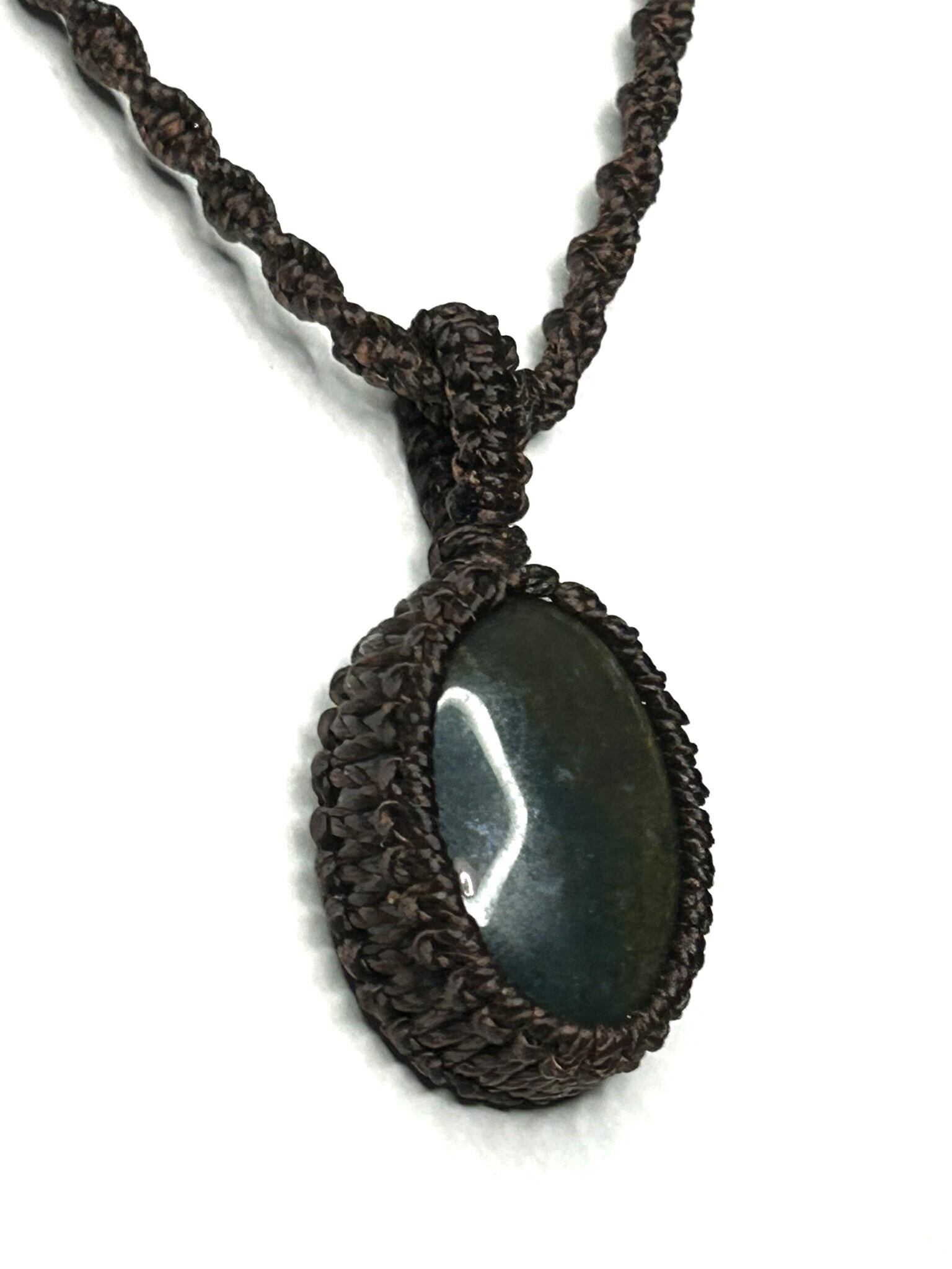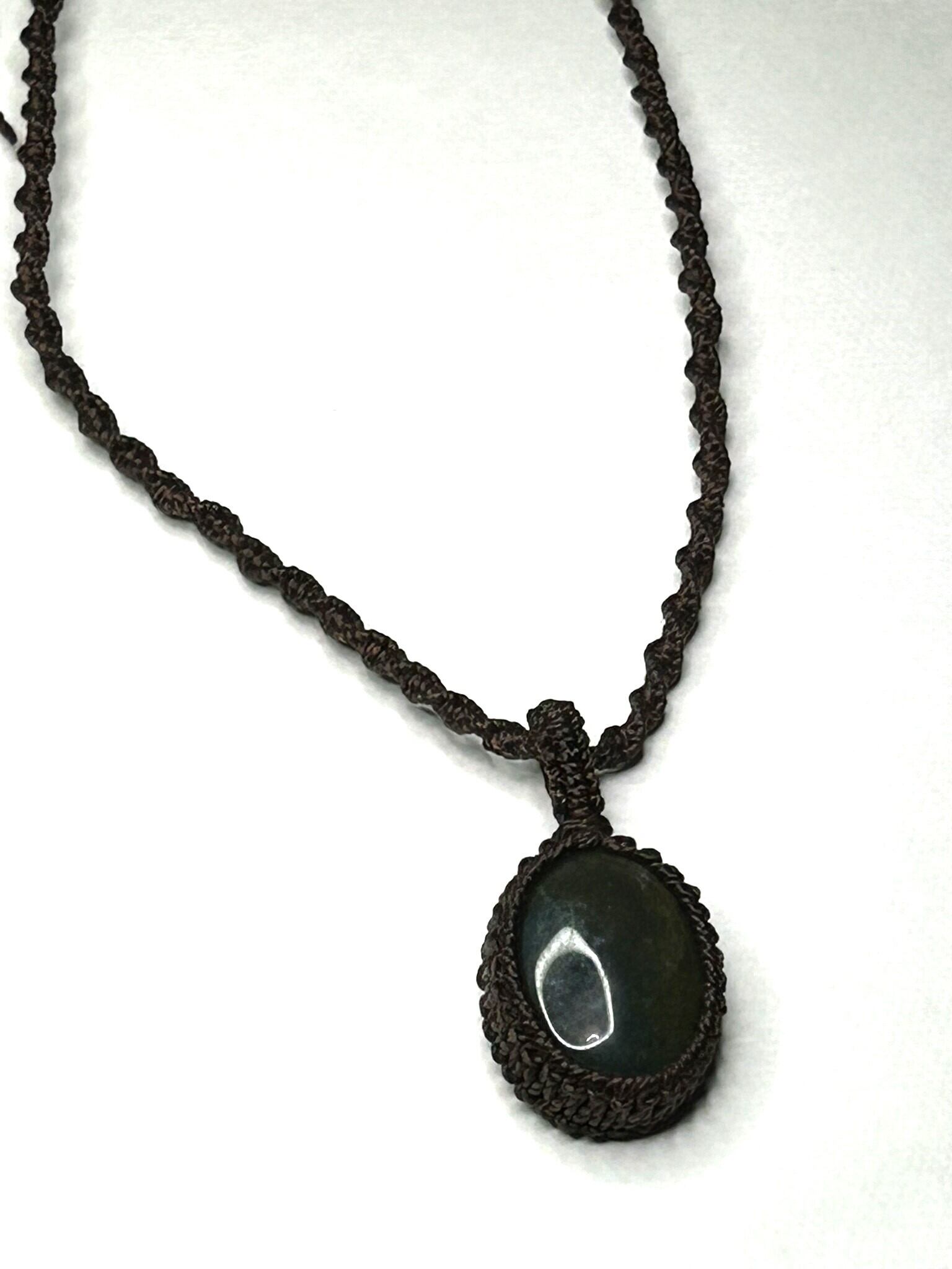 モスアゲートのカボションをマクラメでペンダントにしました。