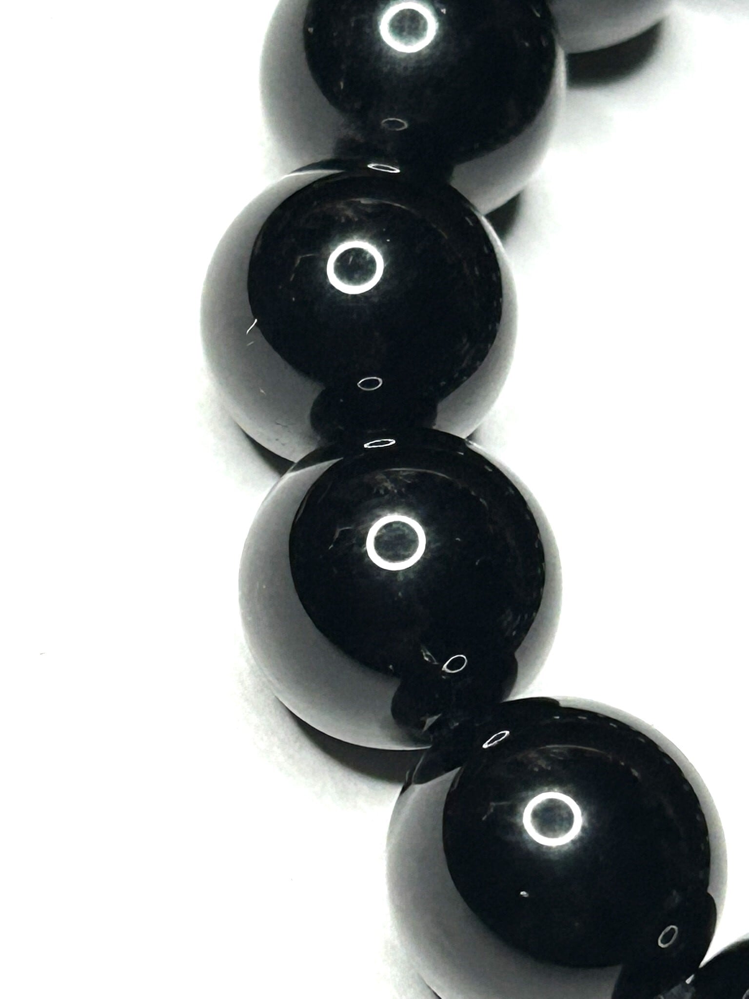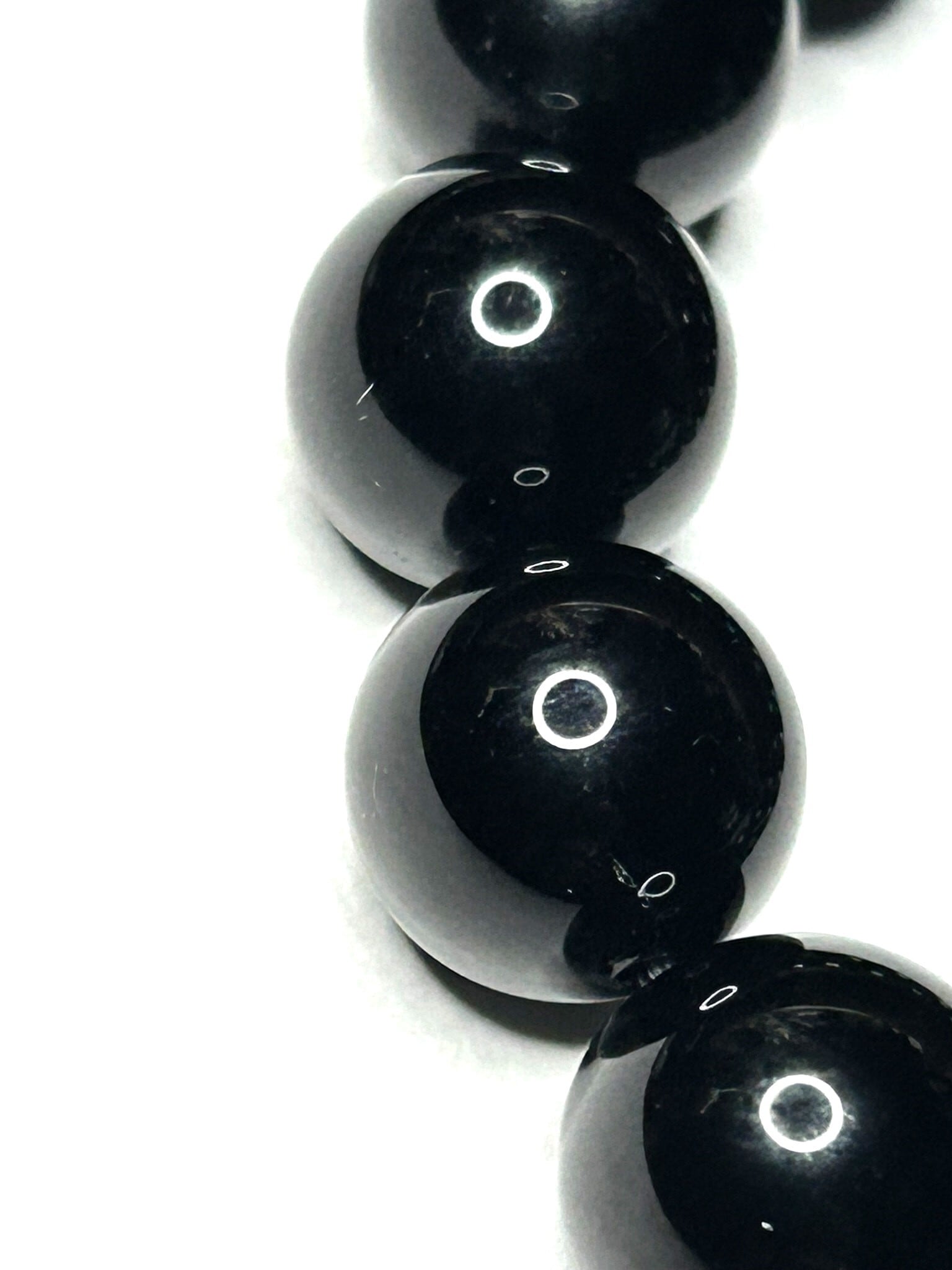画像では伝わりにくいですが、スマホのライトなどで透かして見ると珠によっては真っ黒なだけではないブラウンに透ける水晶らしい透過性も一部見ることができます。