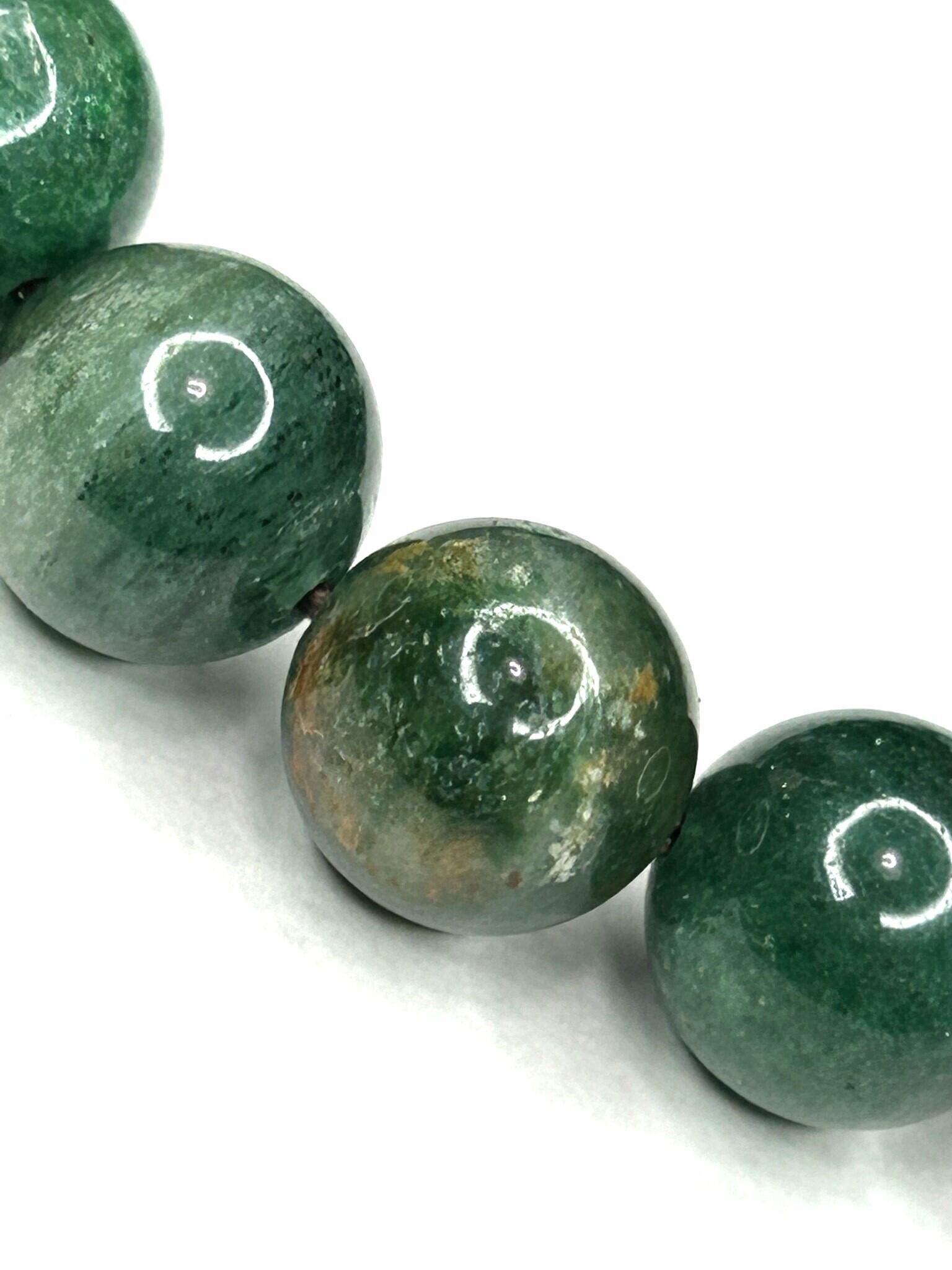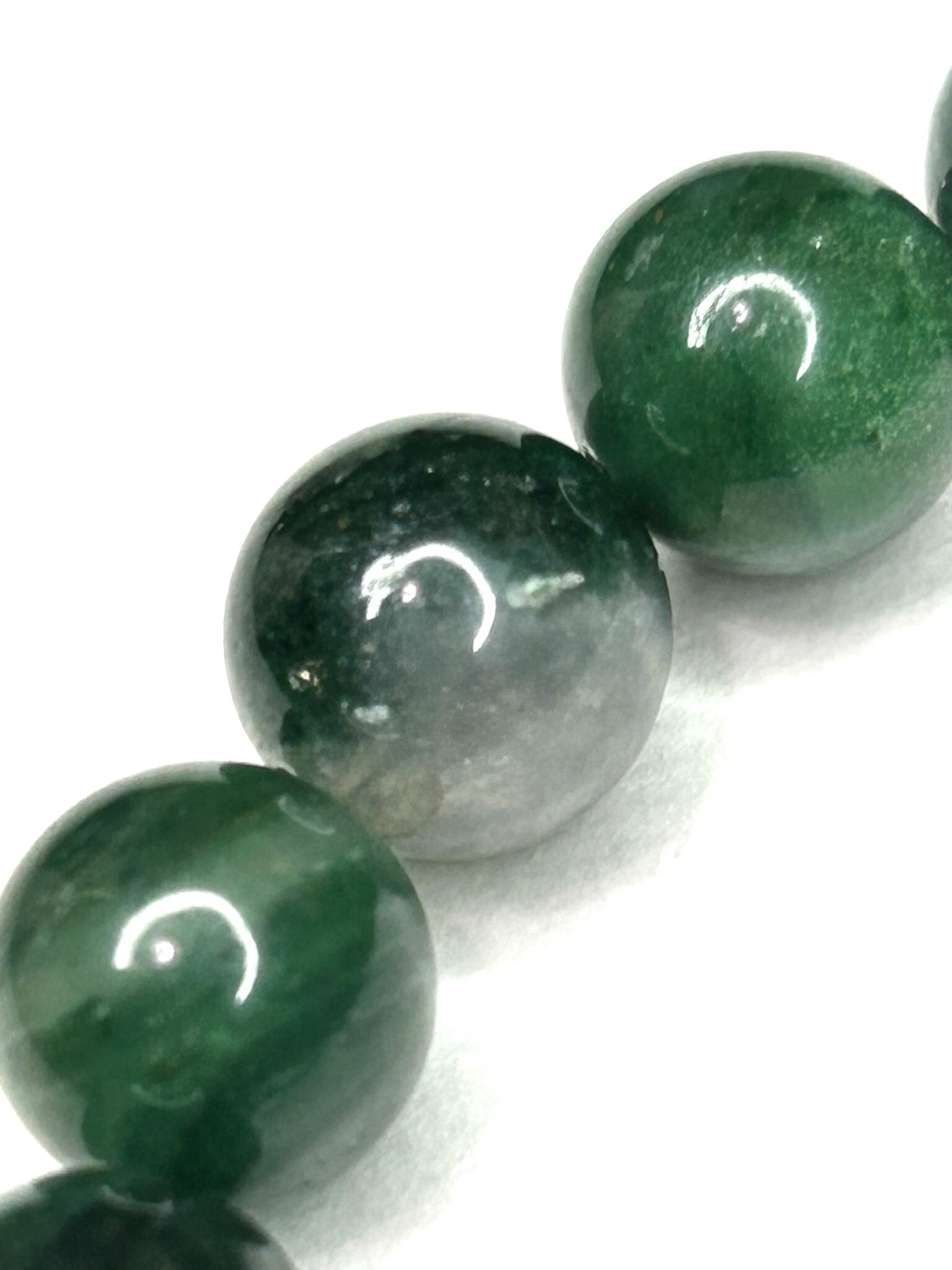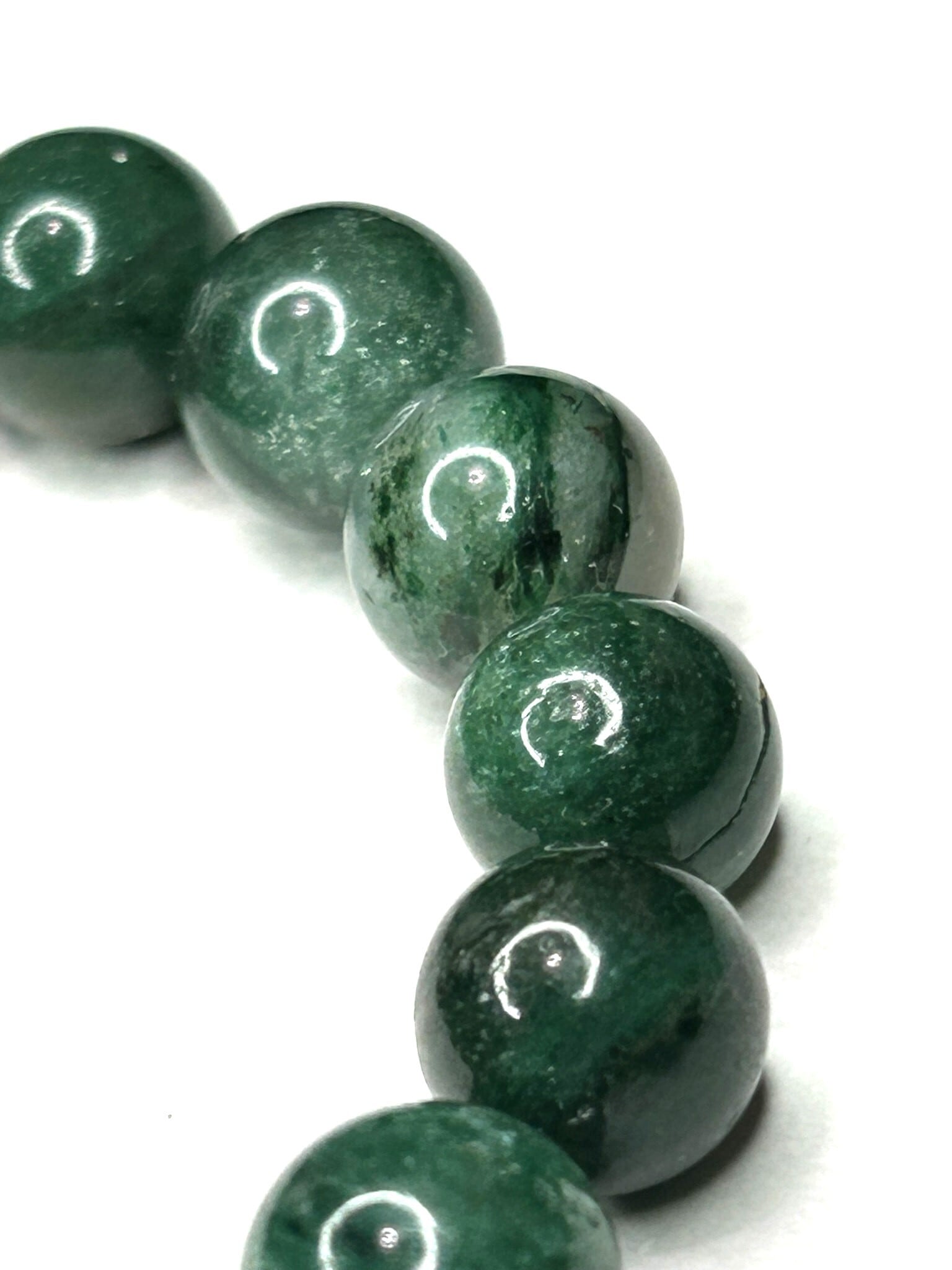 こちらのブレスレットは、10mmの大粒ビーズを使用し、手元にしっかりとした存在感を与えながらも落ち着いたグリーンがやわらかく馴染む、ナチュラルな雰囲気に仕上がっています。