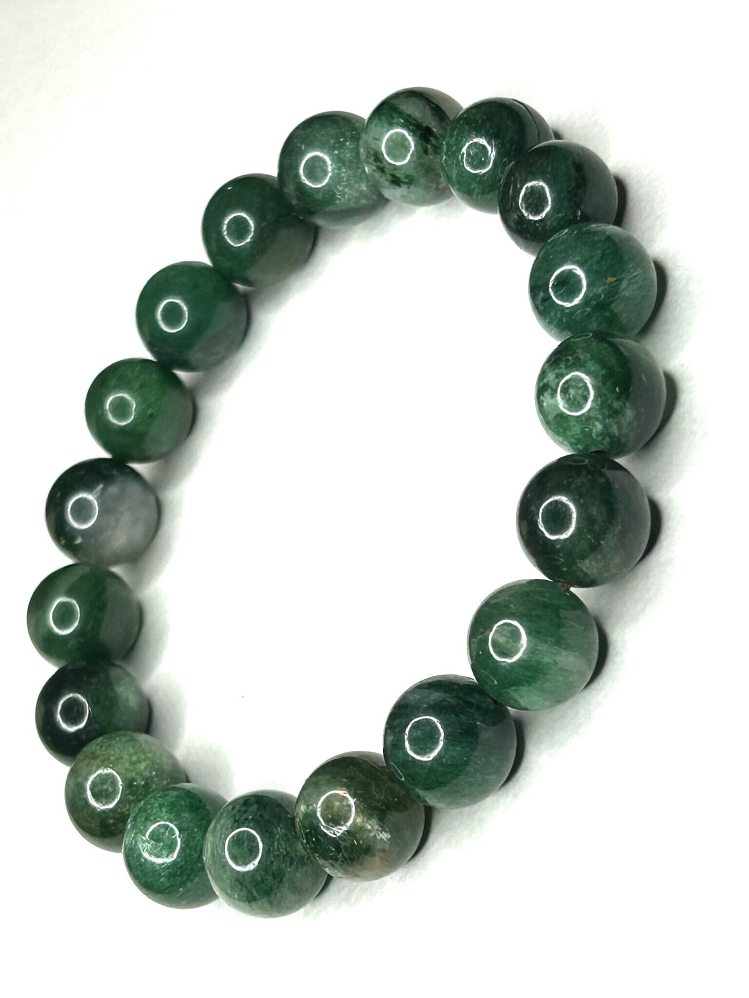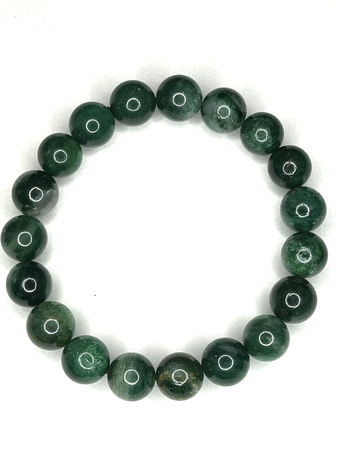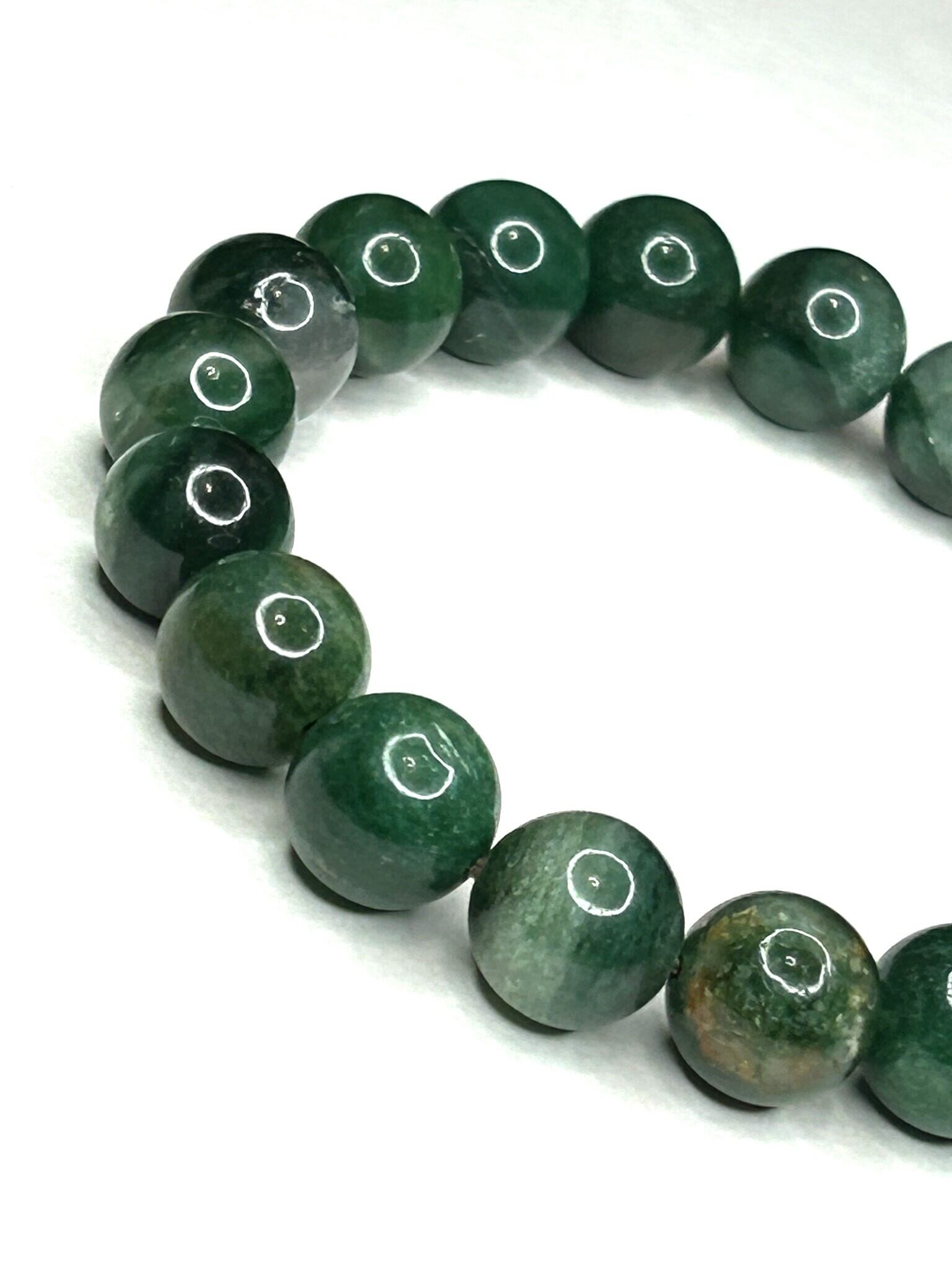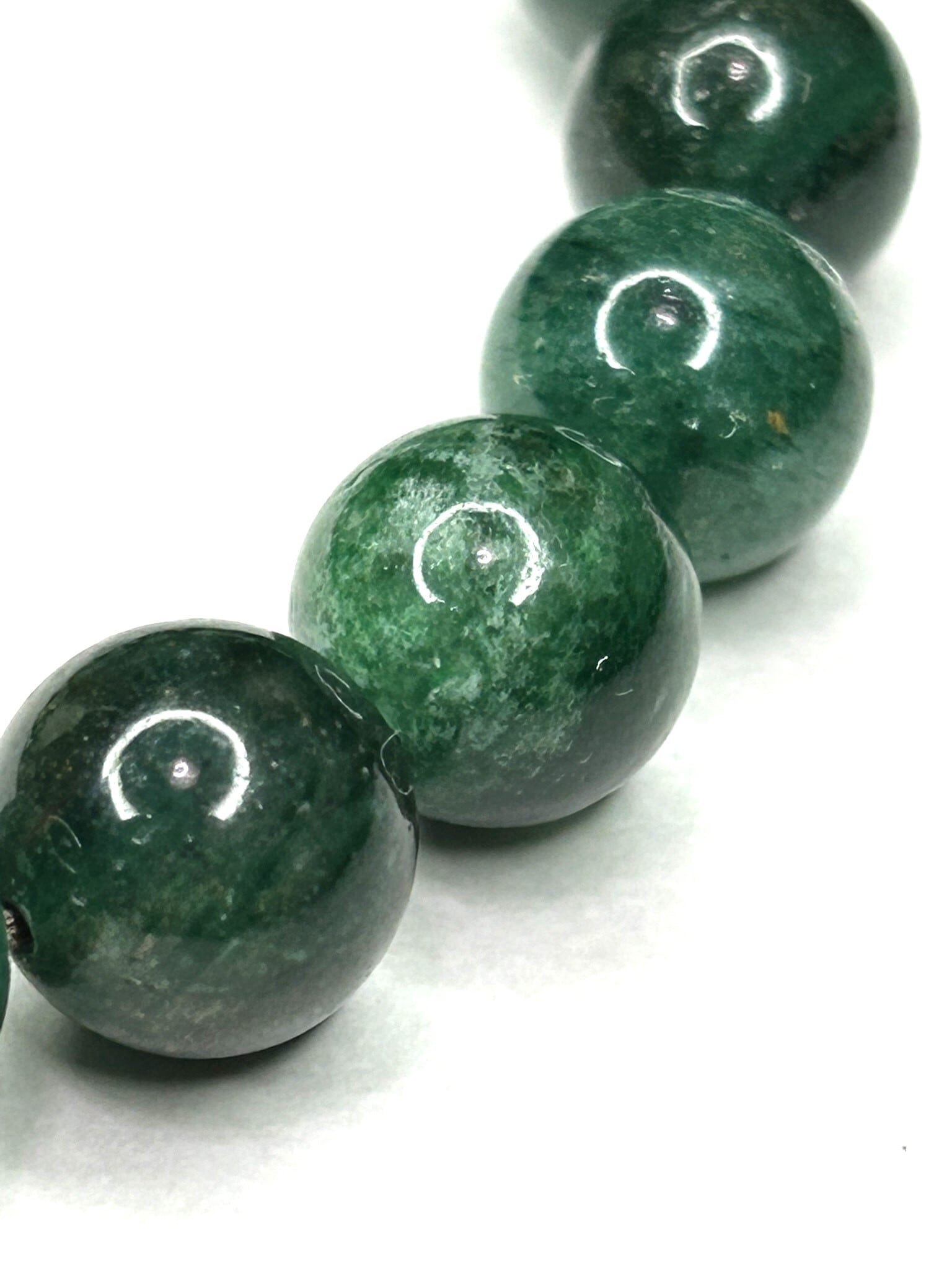 こちらのブレスレットは、10mmの大粒ビーズを使用し、手元にしっかりとした存在感を与えながらも落ち着いたグリーンがやわらかく馴染む、ナチュラルな雰囲気に仕上がっています。