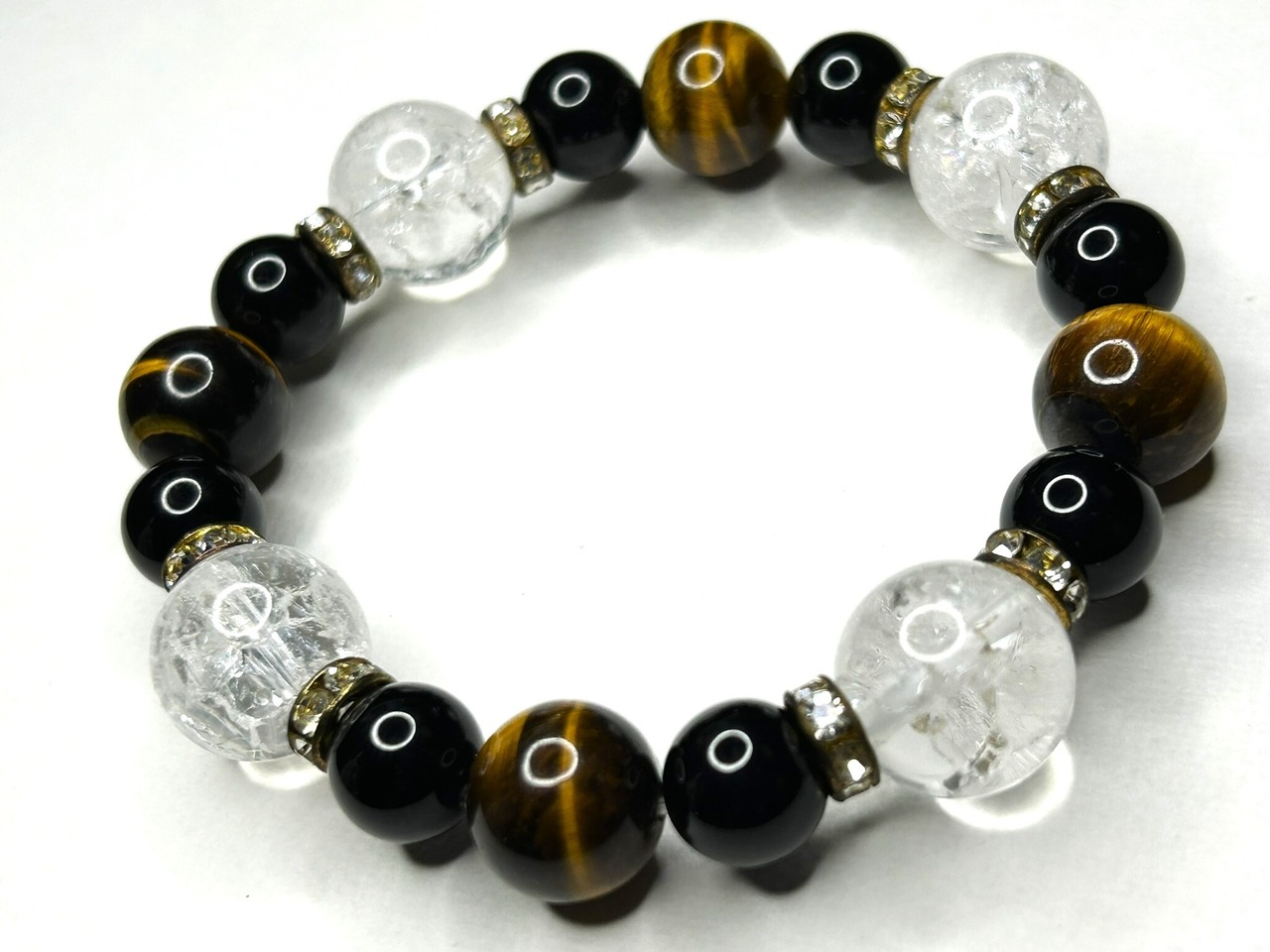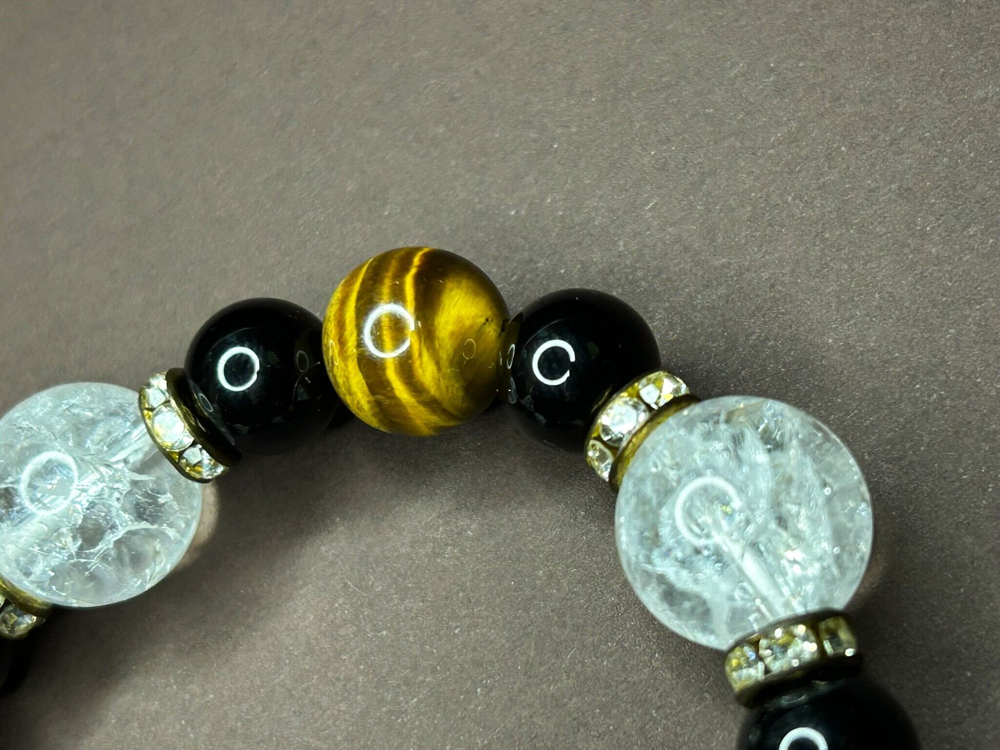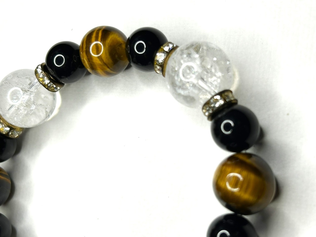 クラック水晶14mm、タイガーアイ12mm、ブラックオニキス10mmを組み合わせ、