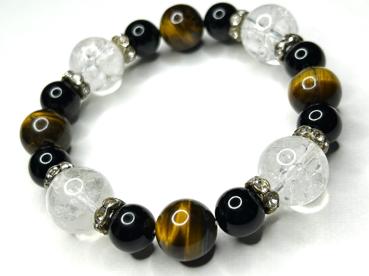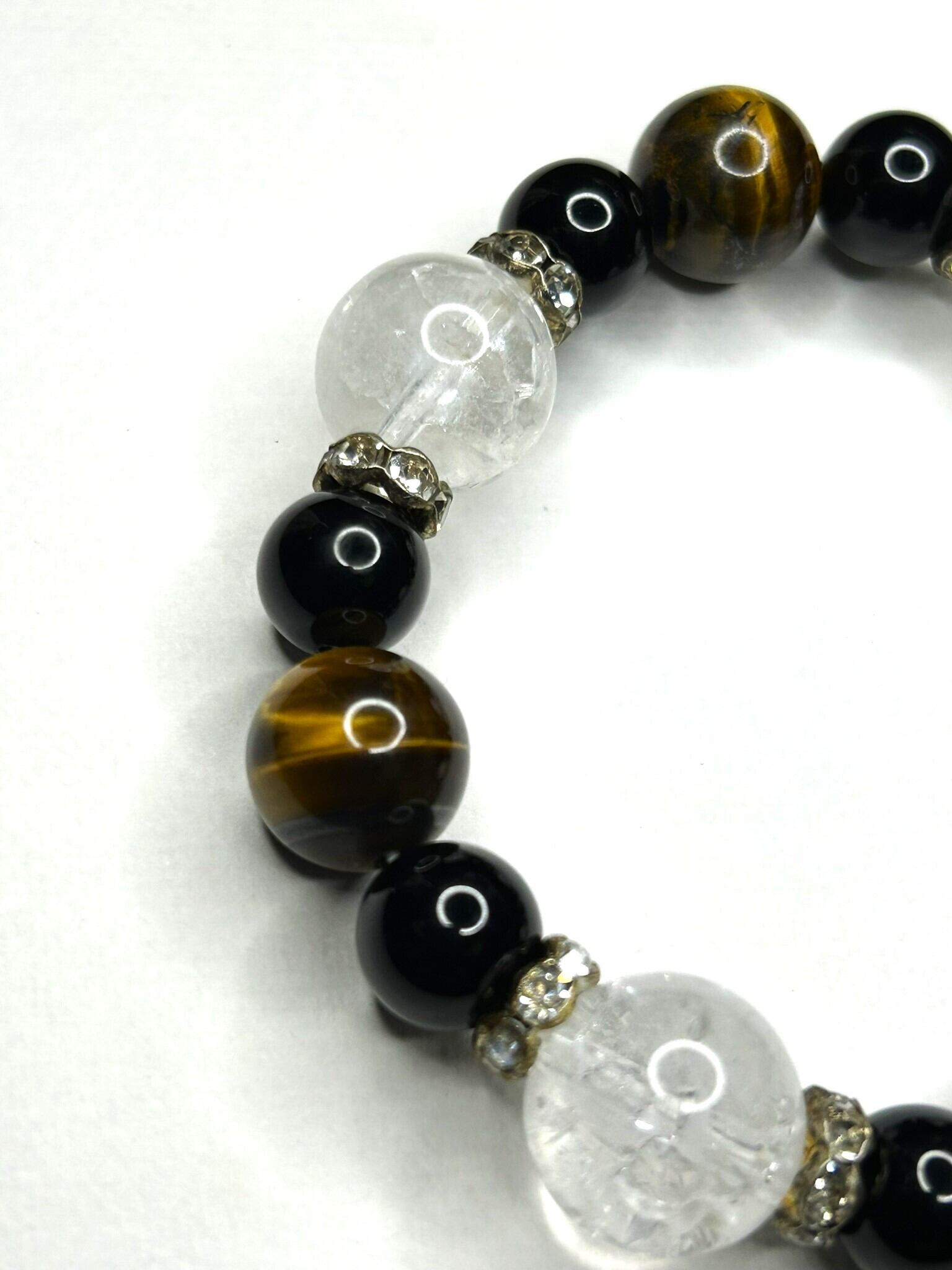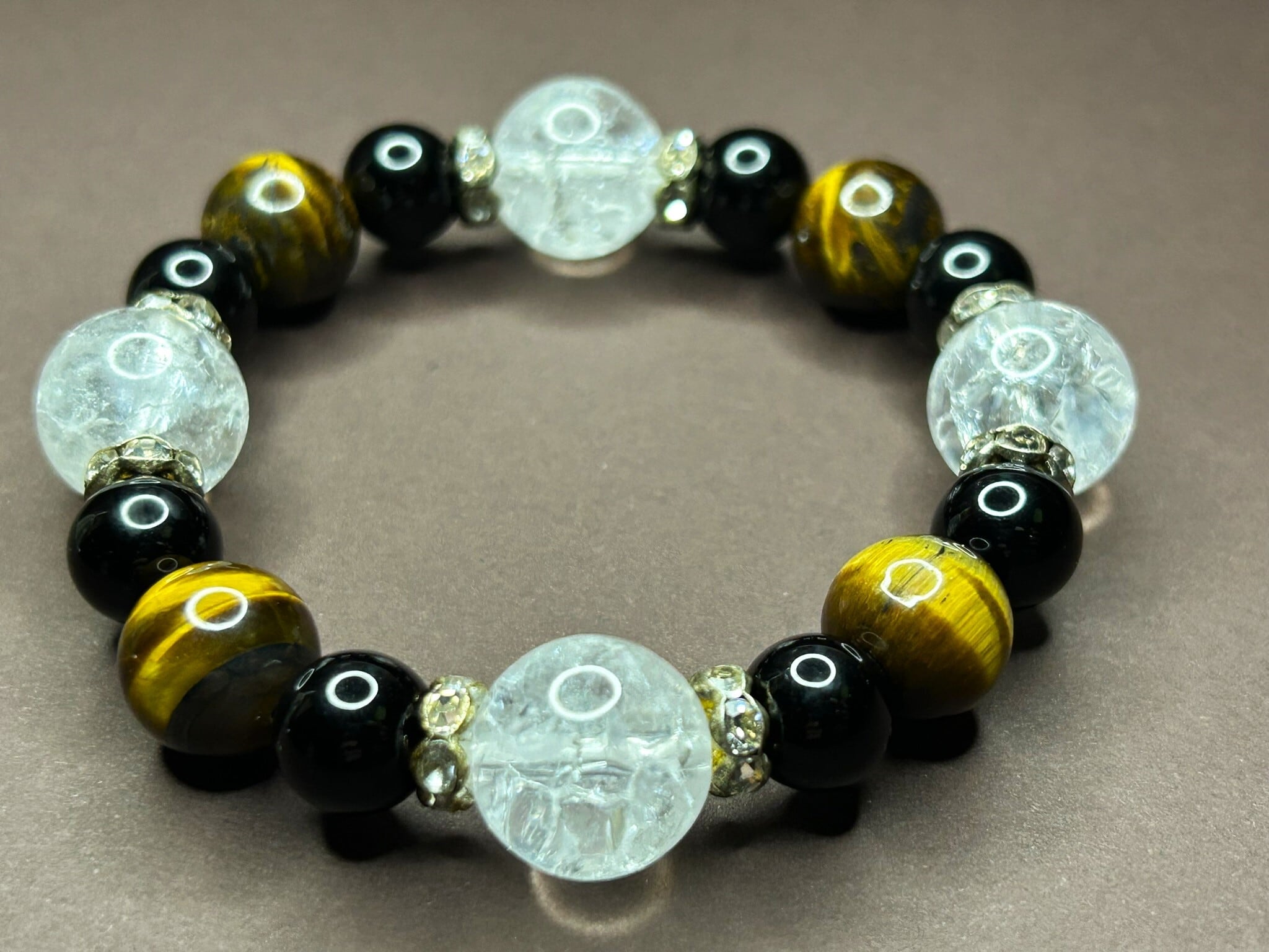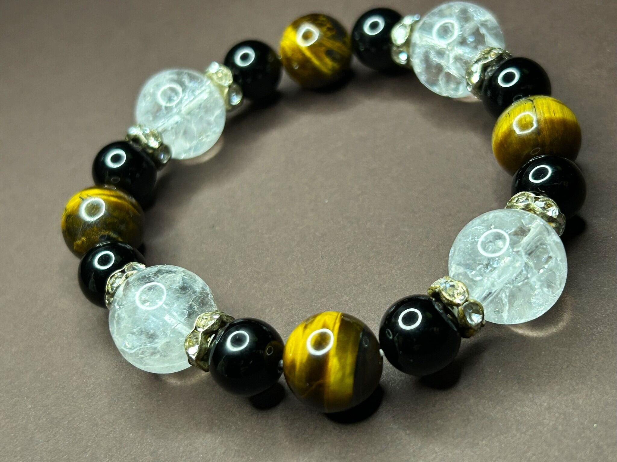 クラック水晶14mm、タイガーアイ12mm、ブラックオニキス10mmを組み合わせ、