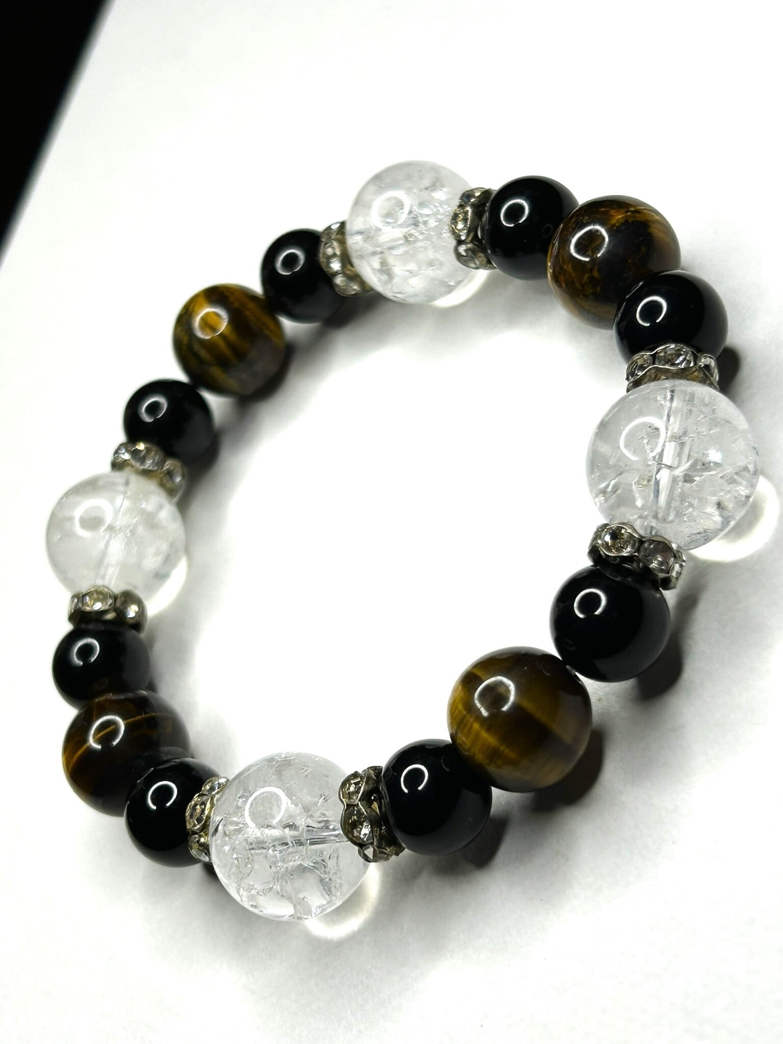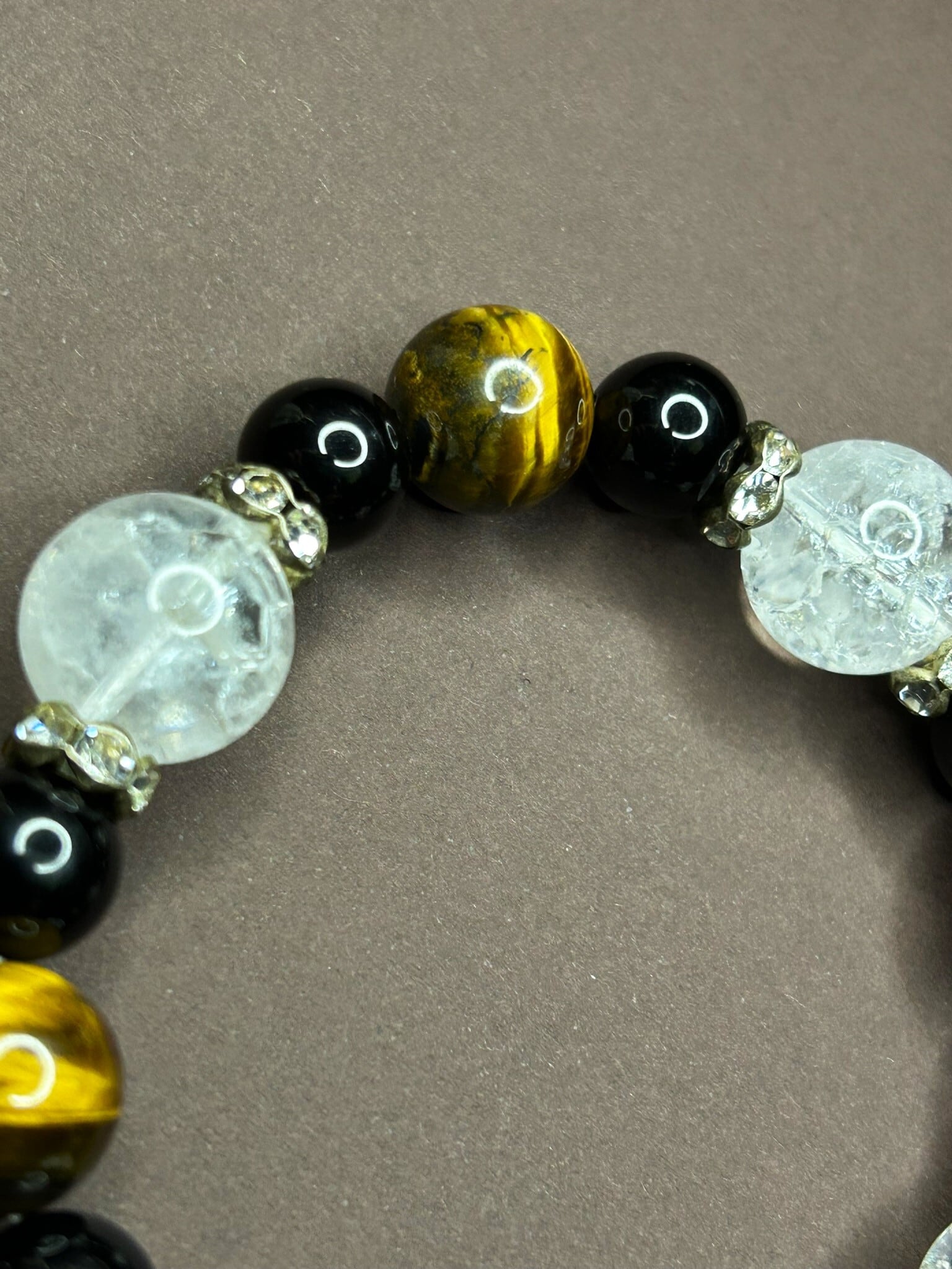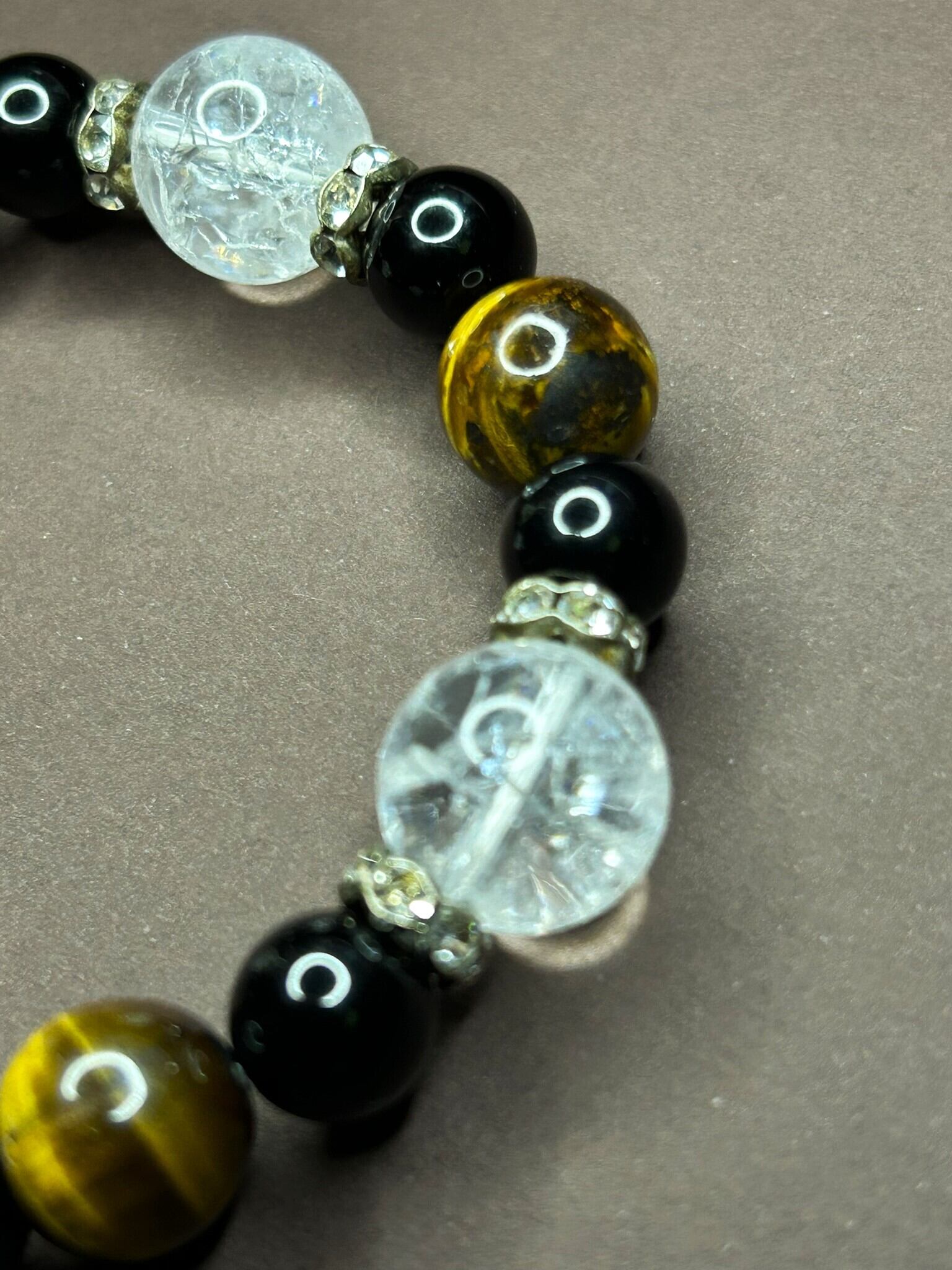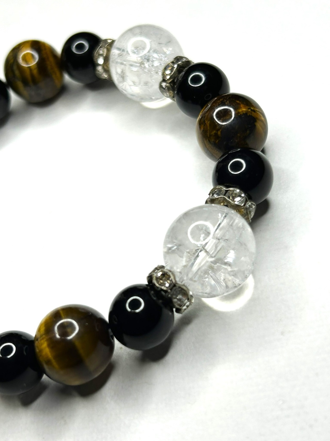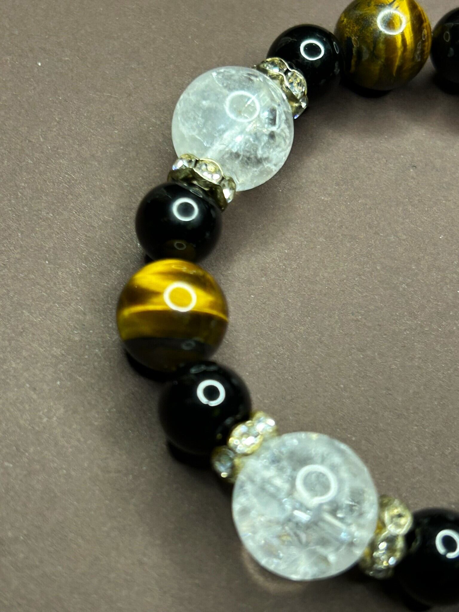 クラック水晶14mm、タイガーアイ12mm、ブラックオニキス10mmを組み合わせ、