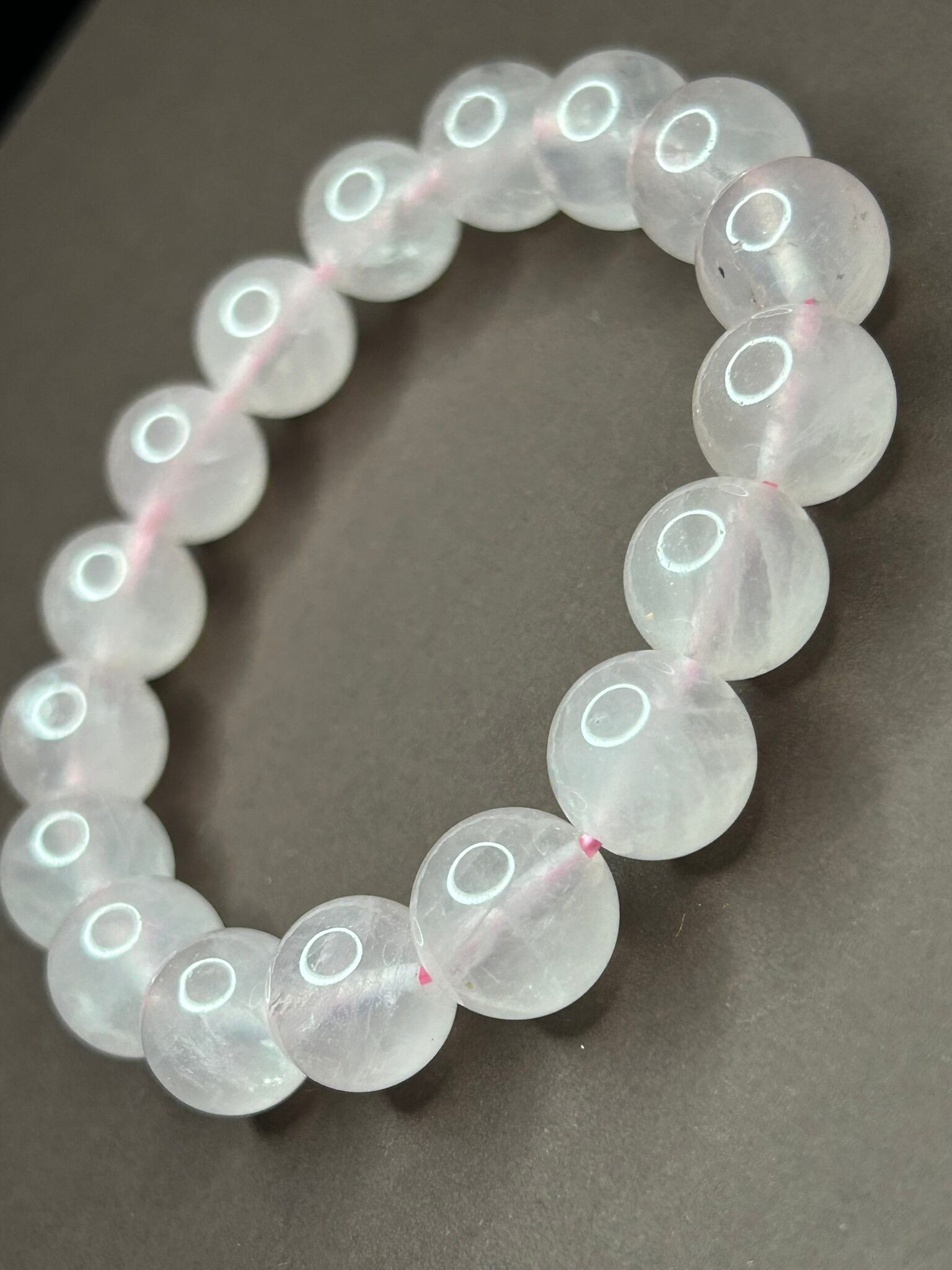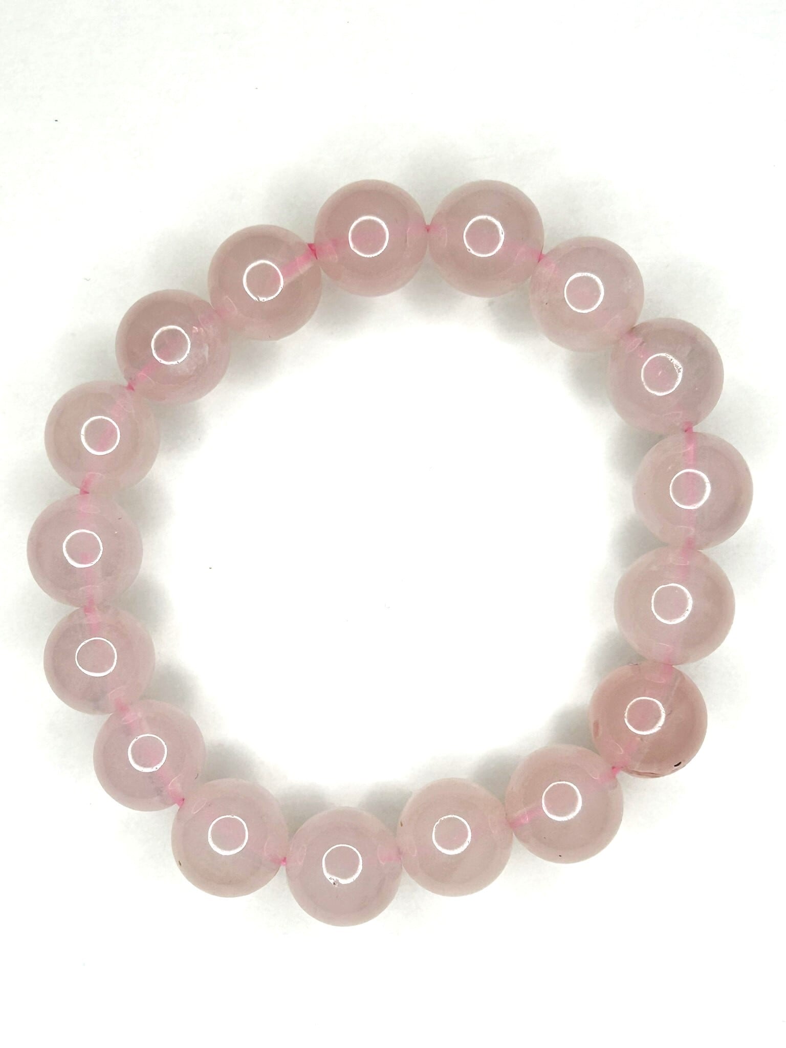 人工的な色の調整がされていない天然色のローズクォーツ、12mm珠のブレスレットです。