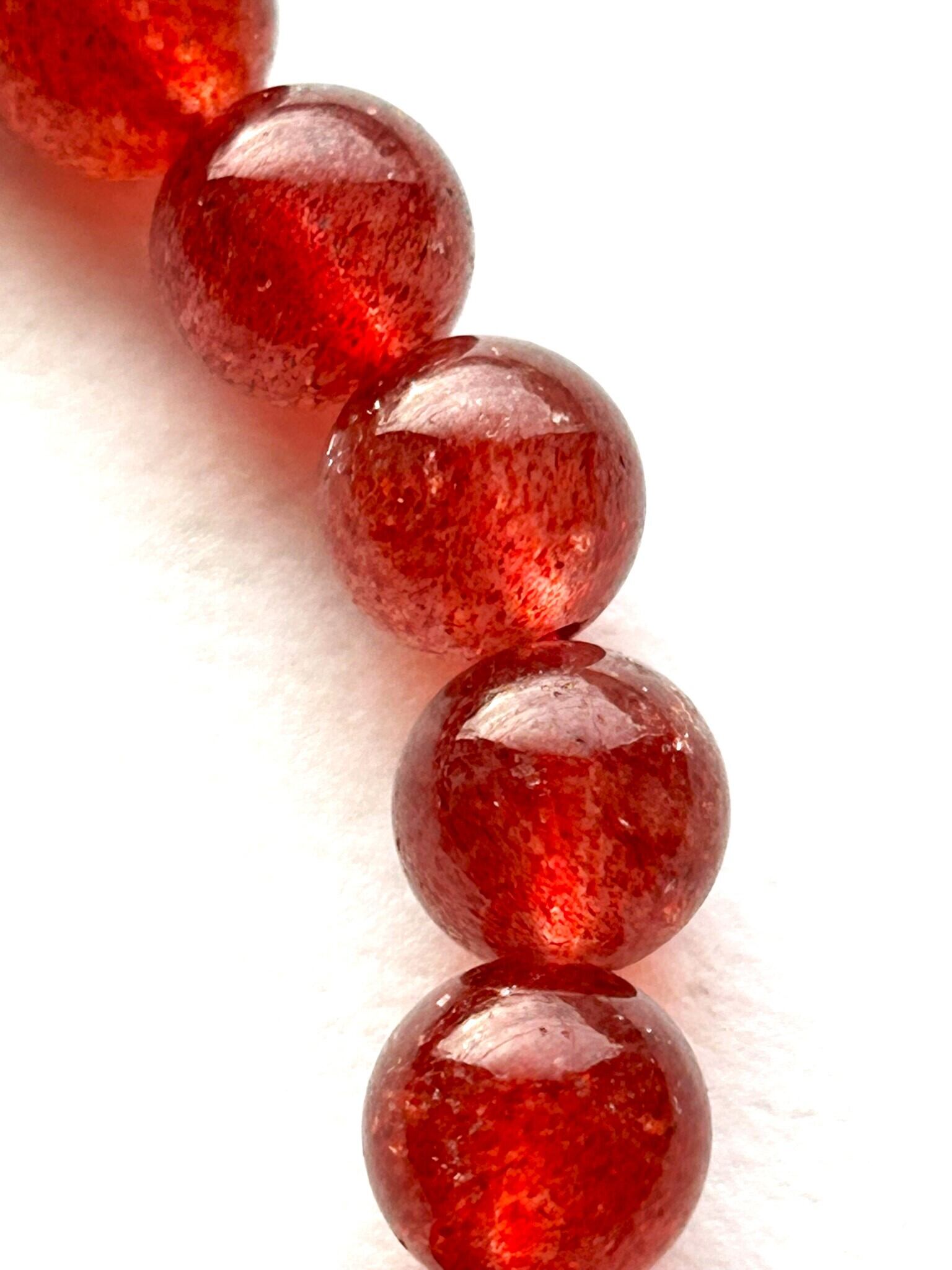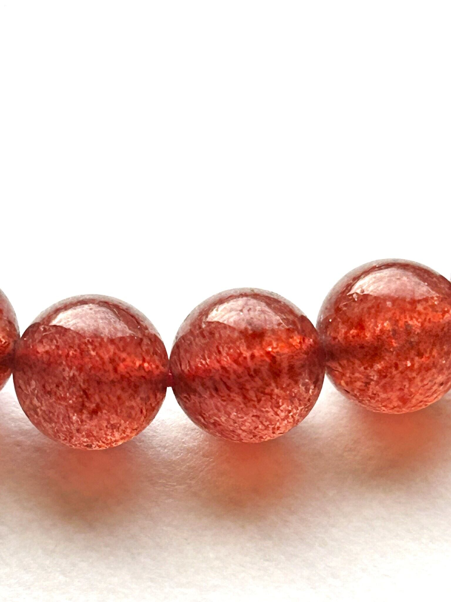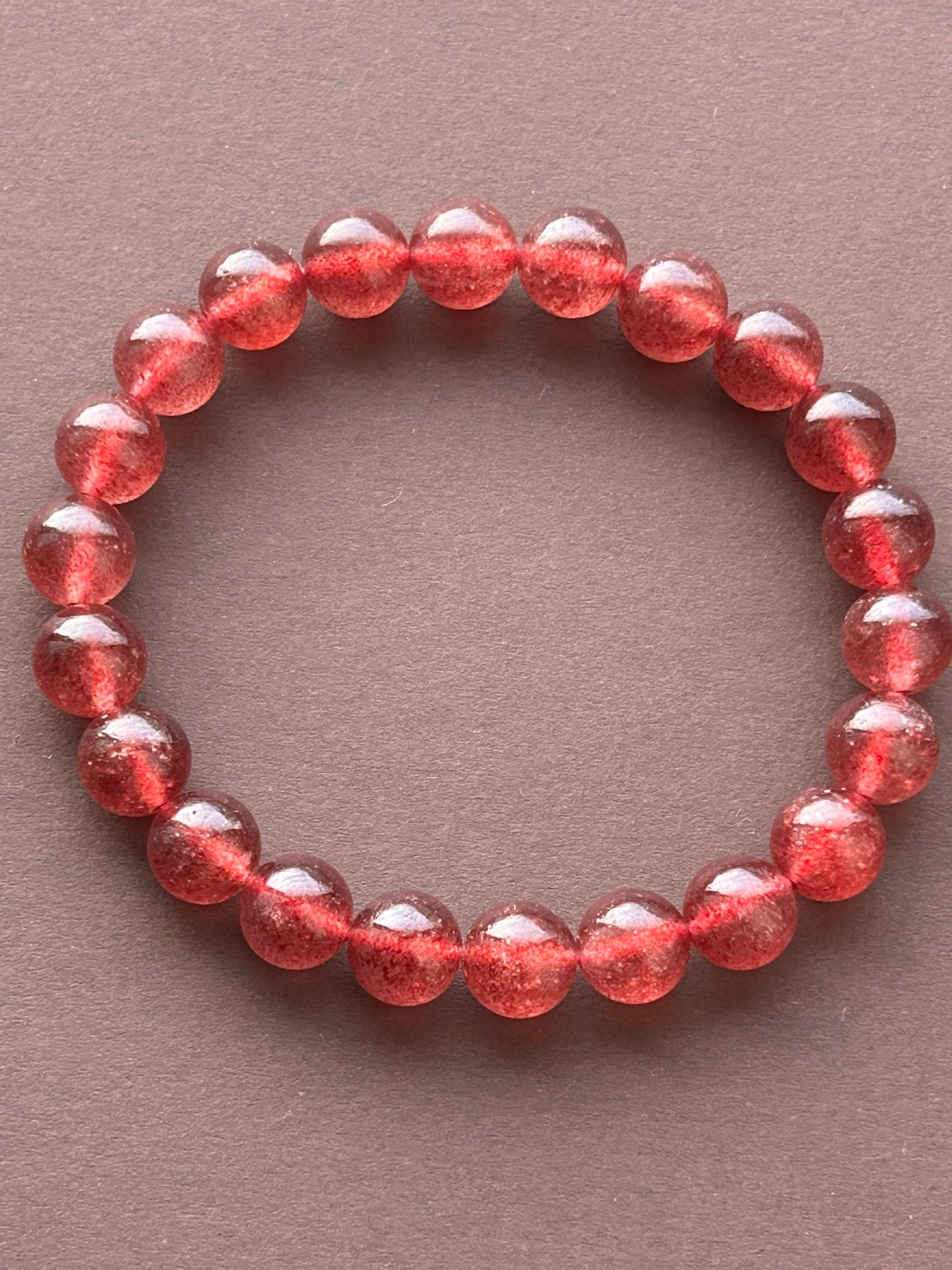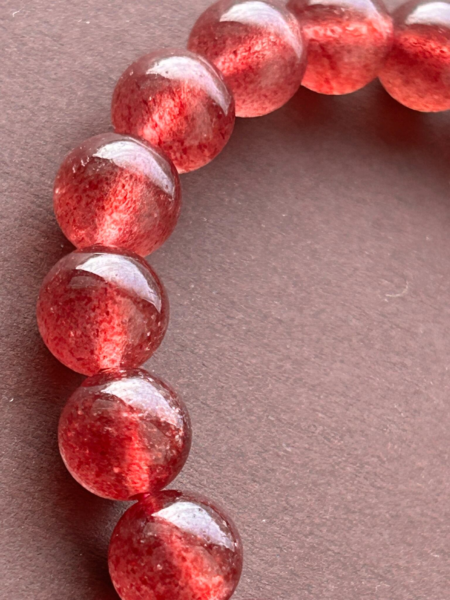 透明感のある水晶の中に、赤〜ピンクの内包物がふわりと広がる、タンザニア産ストロベリークォーツのブレスレットです。