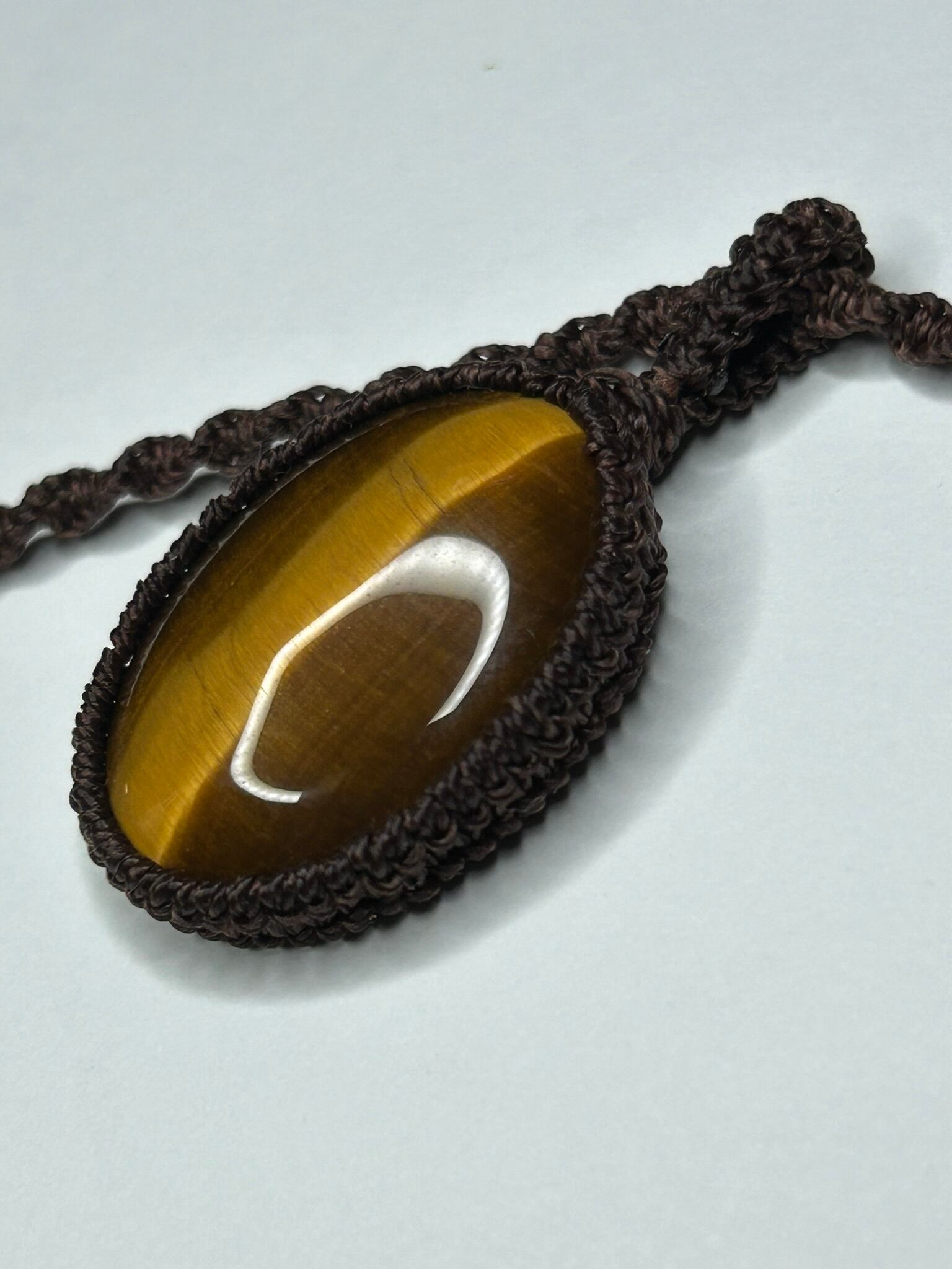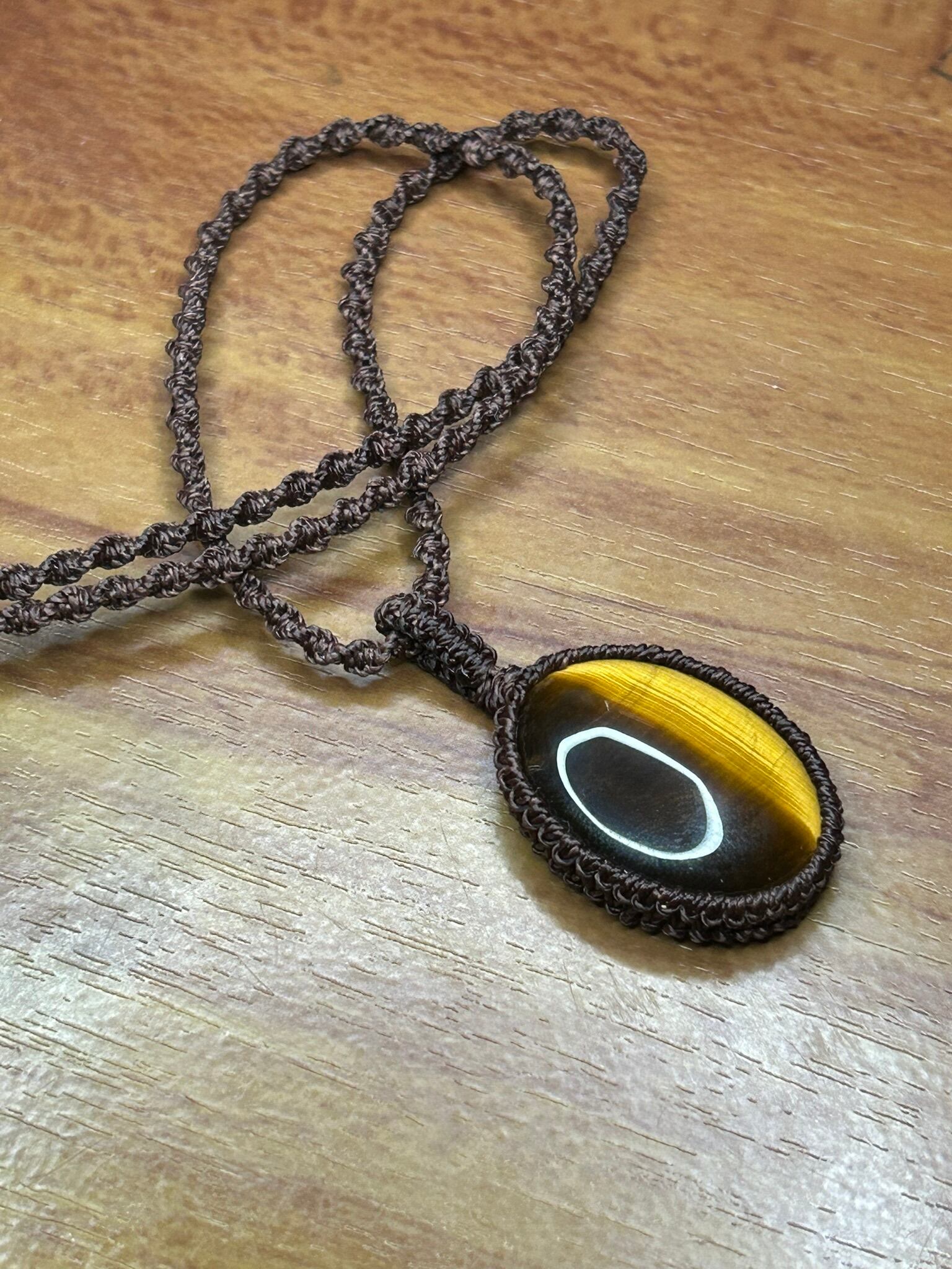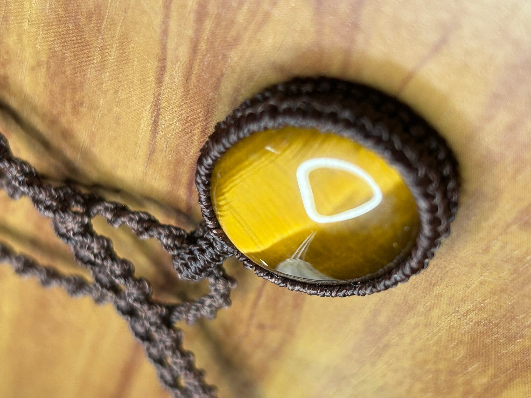 イエロータイガーアイのカボションをマクラメでペンダントにしました。