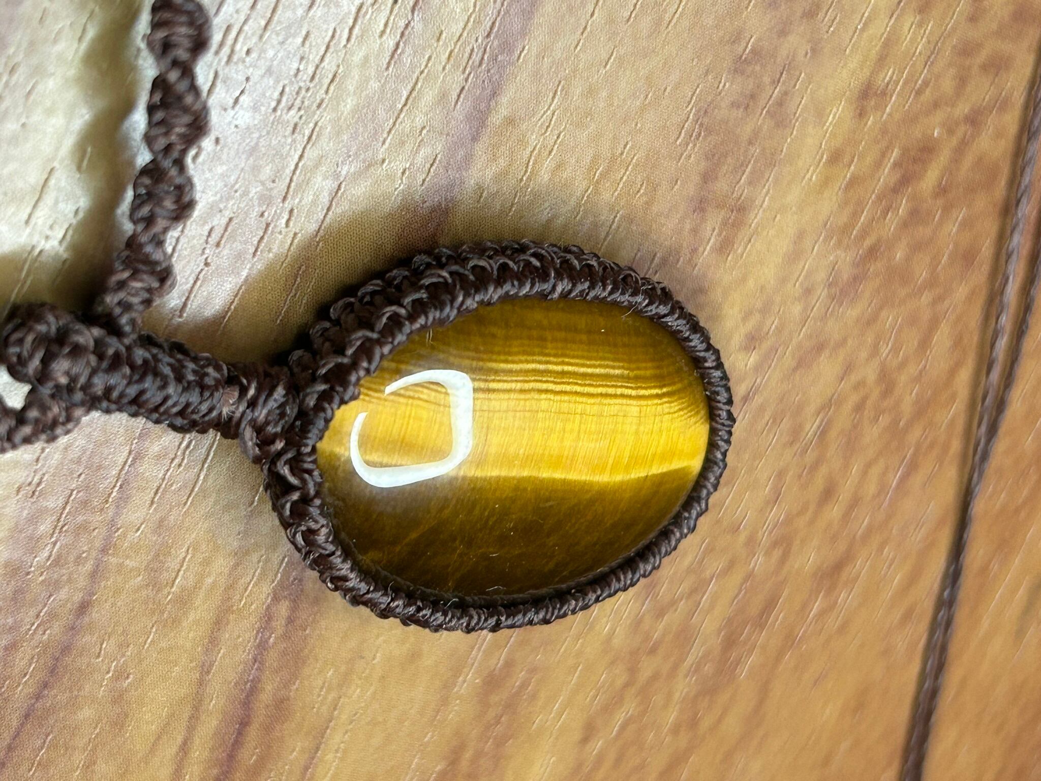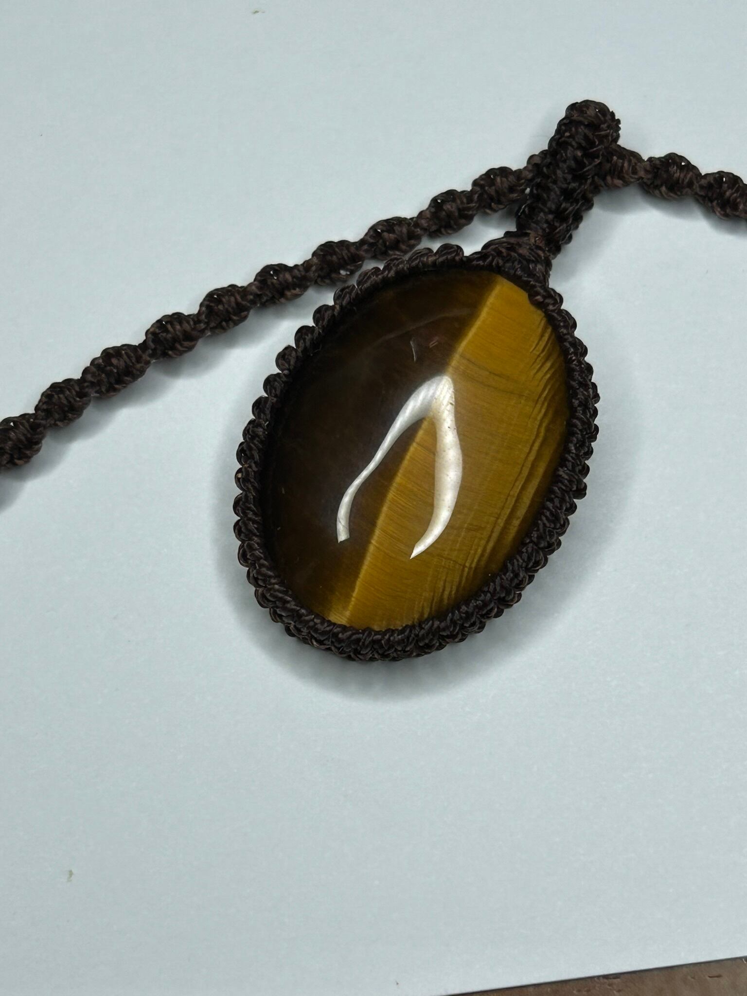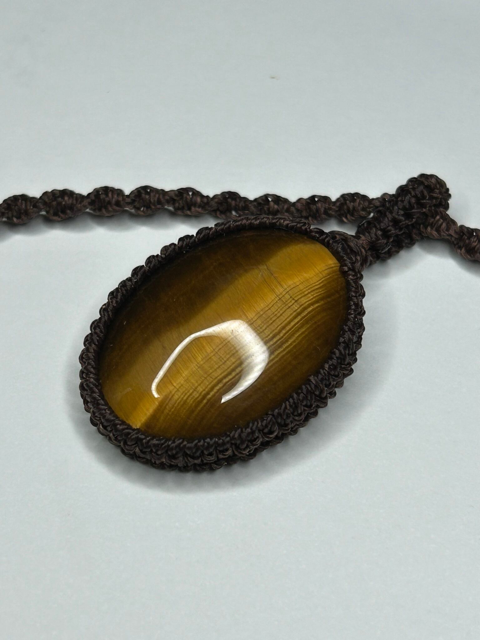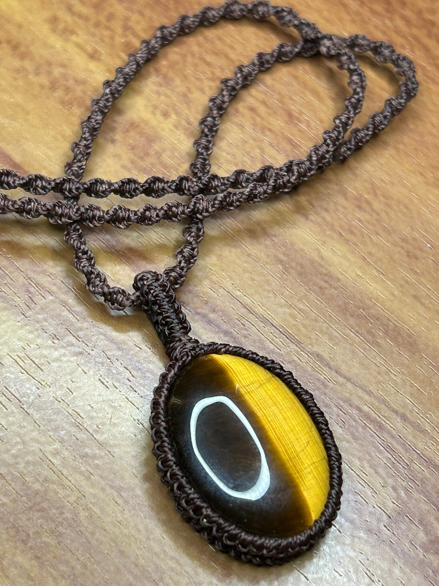 イエロータイガーアイのカボションをマクラメでペンダントにしました。