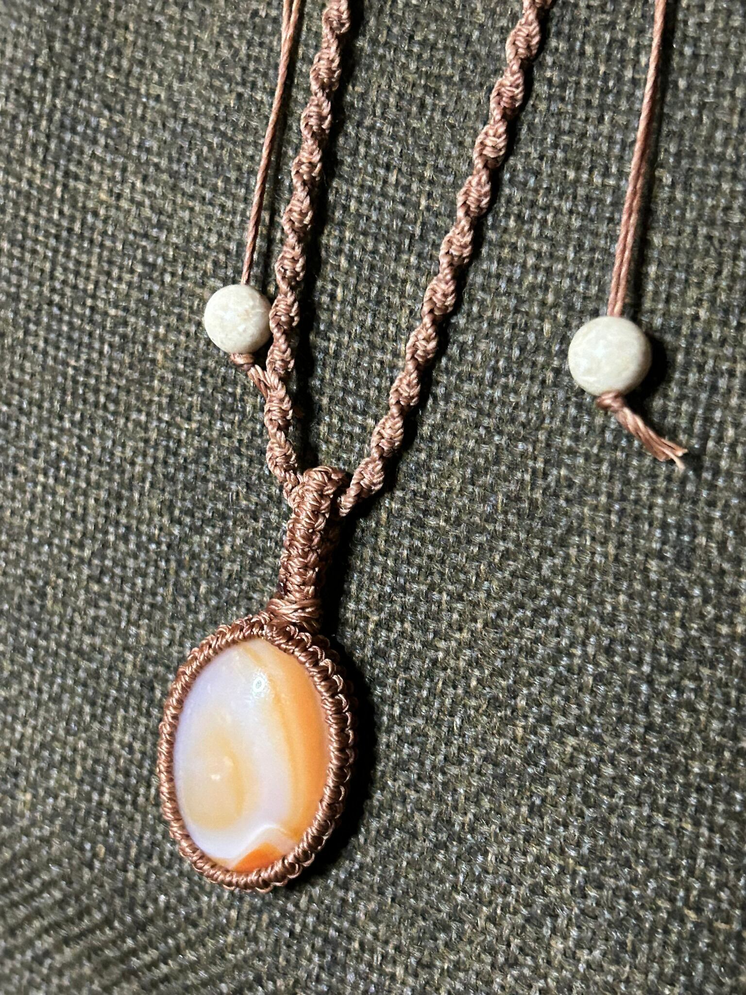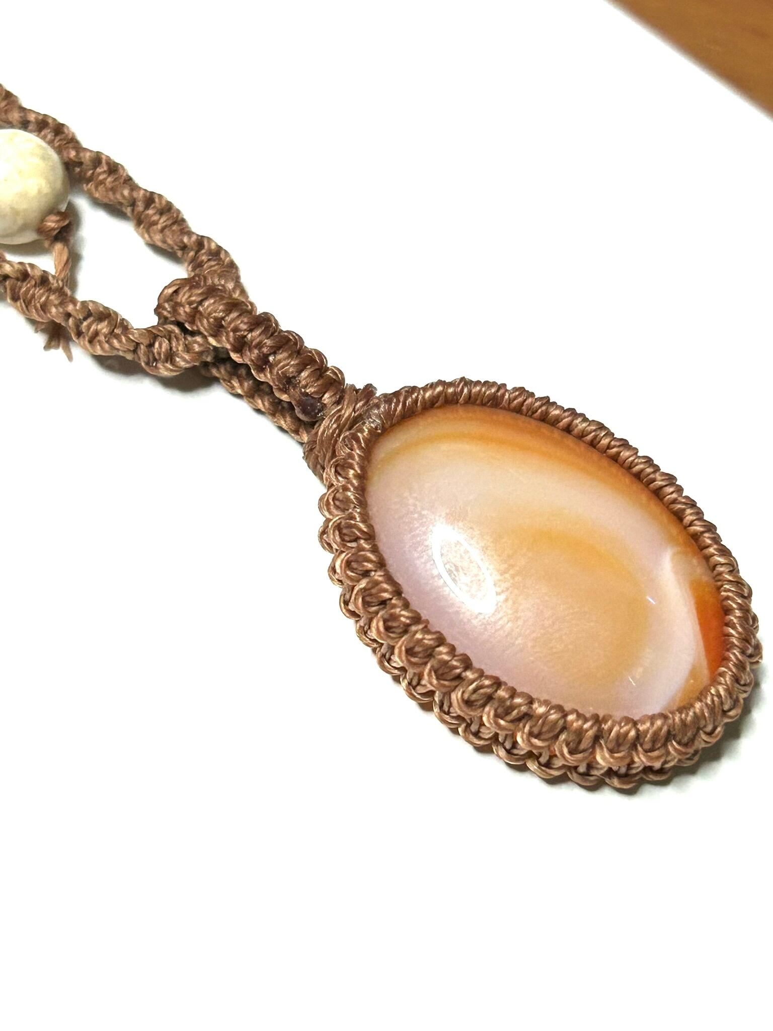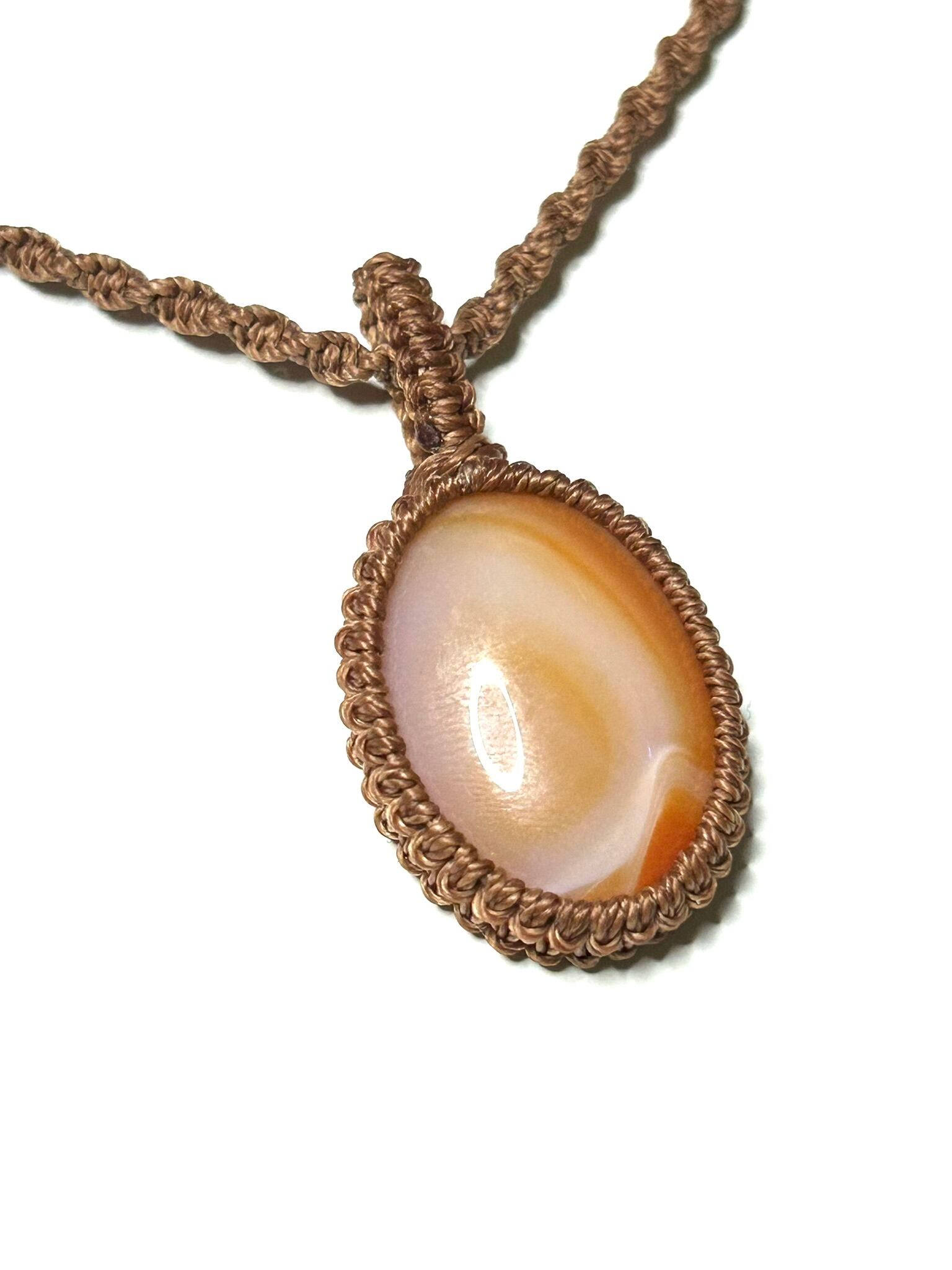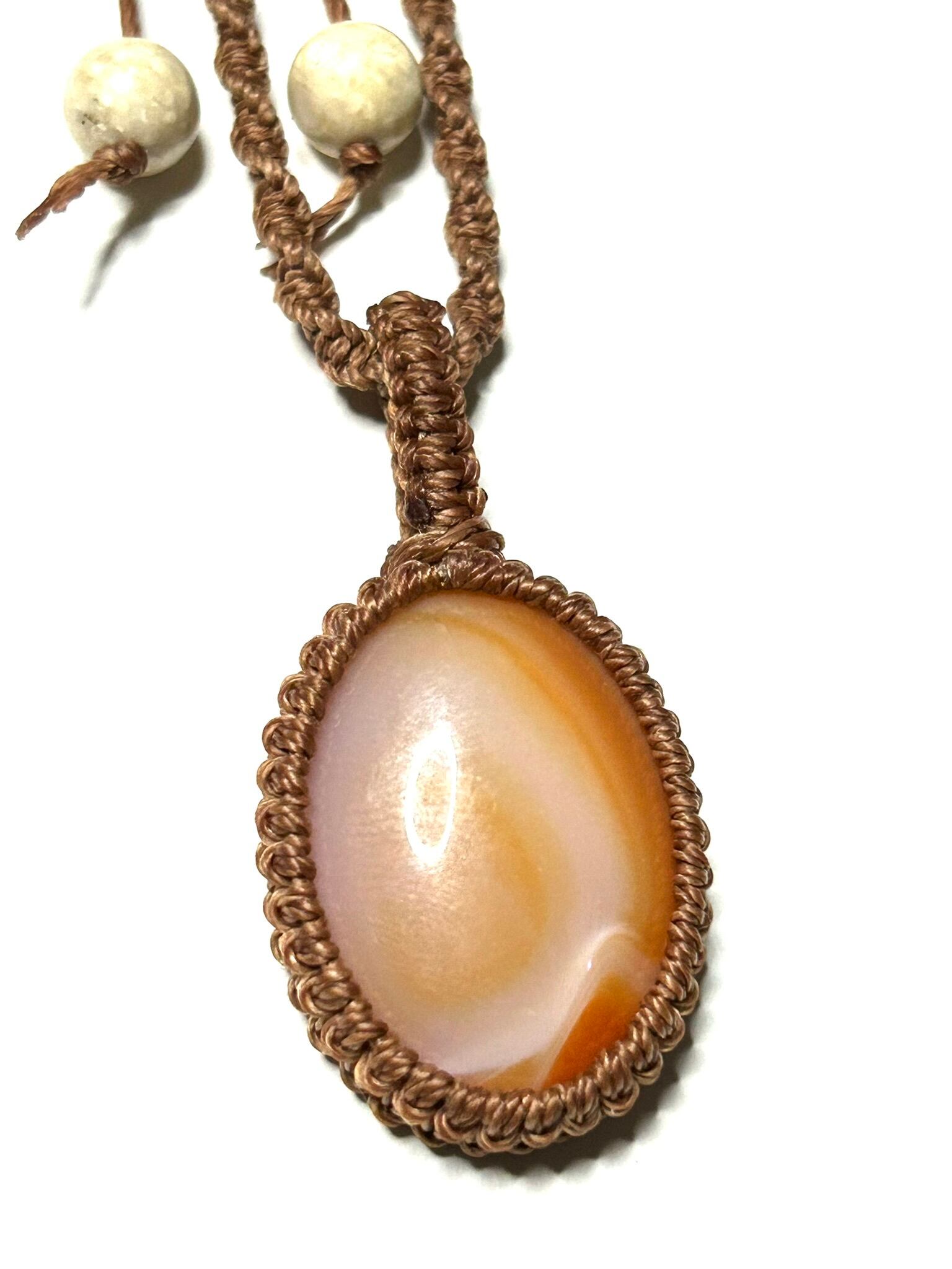 カーネリアンサードニクスのカボションをマクラメでペンダントにしました。